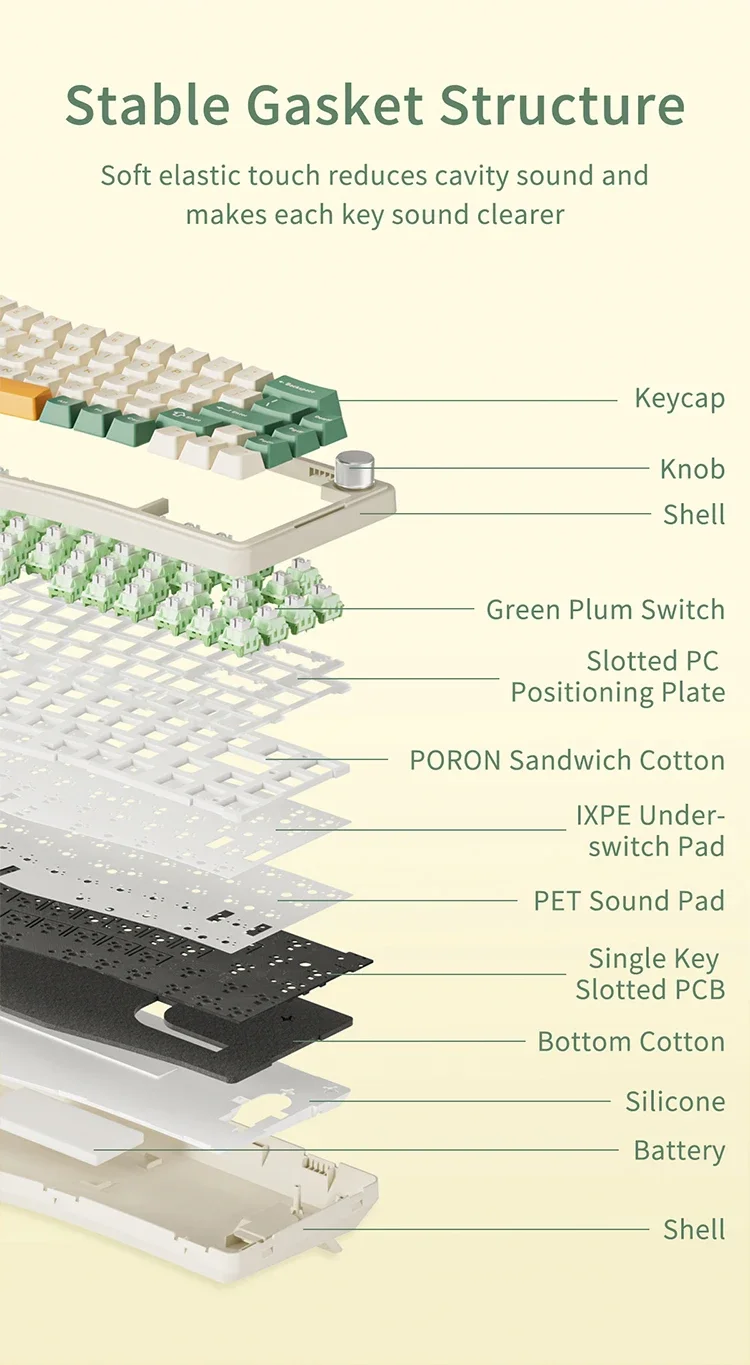 El sistema de montaje de juntas de Ajazz AKS068 Pro le permite experimentar un placer completamente nuevo de escribir.Este diseño innovador permite que el teclado flutue dentro de la carcasa sin necesidad de tornillos y proporciona una sensación de escritura uniforme.Junto con materiales que absorben el sonido como la silicona y la espuma de algodón, cada pulsación de tecla se vuelve suave.