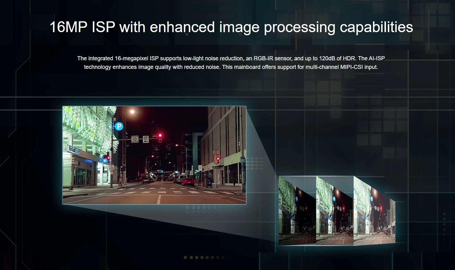 ISPEl ISP integrado de 16 megapíxeles admite reducción de ruido con poca luz, un sensor RGB-IR y hasta 120 dB de HDR.