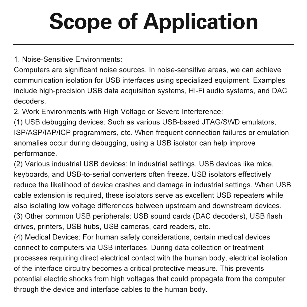 (1) Dispositivos de depuración USB: como simuladores JTAG/SWD para diversas interfaces USB, descargadores de ISP/ISP/IAP/ICP, etc.Cuando se producen frecuentemente fallas en la conexión y anomalías de simulación durante la depuración, se puede utilizar un aislador USB para intentar mejorar.