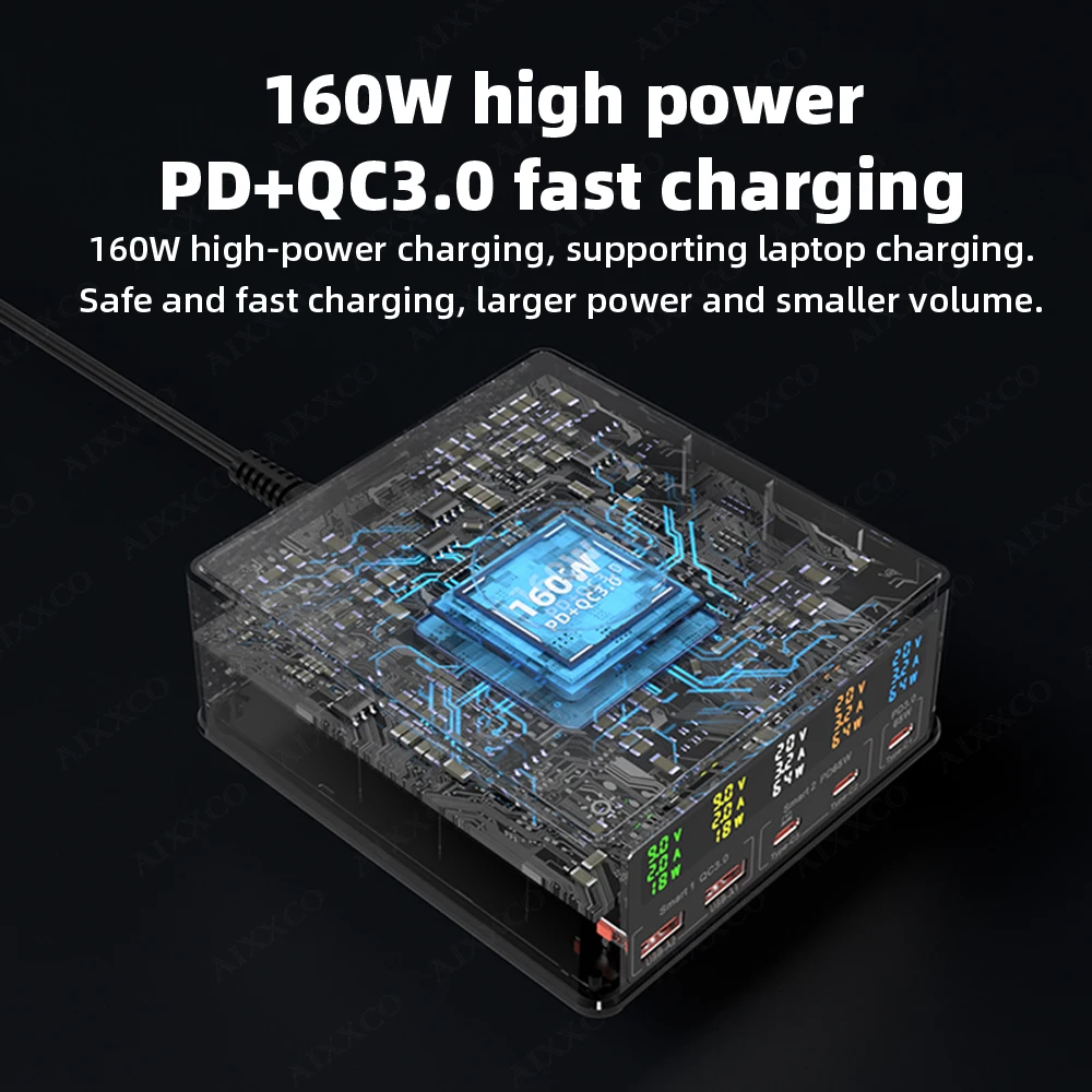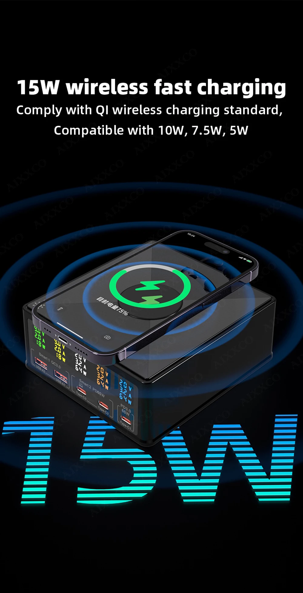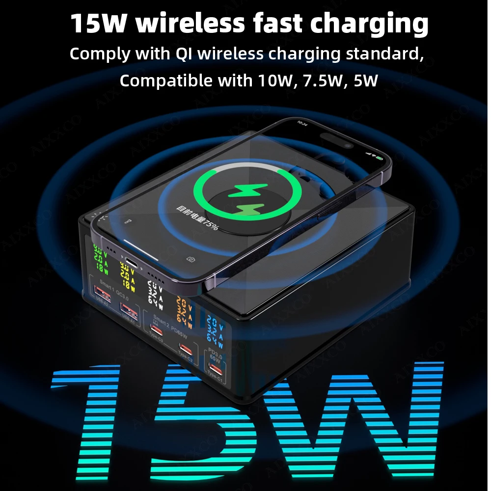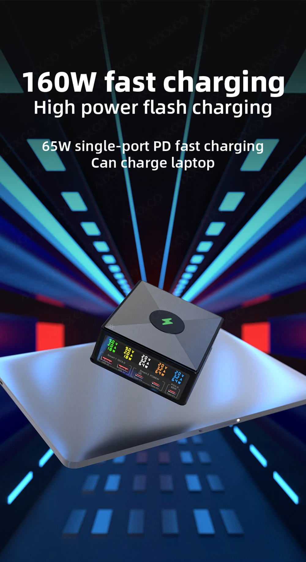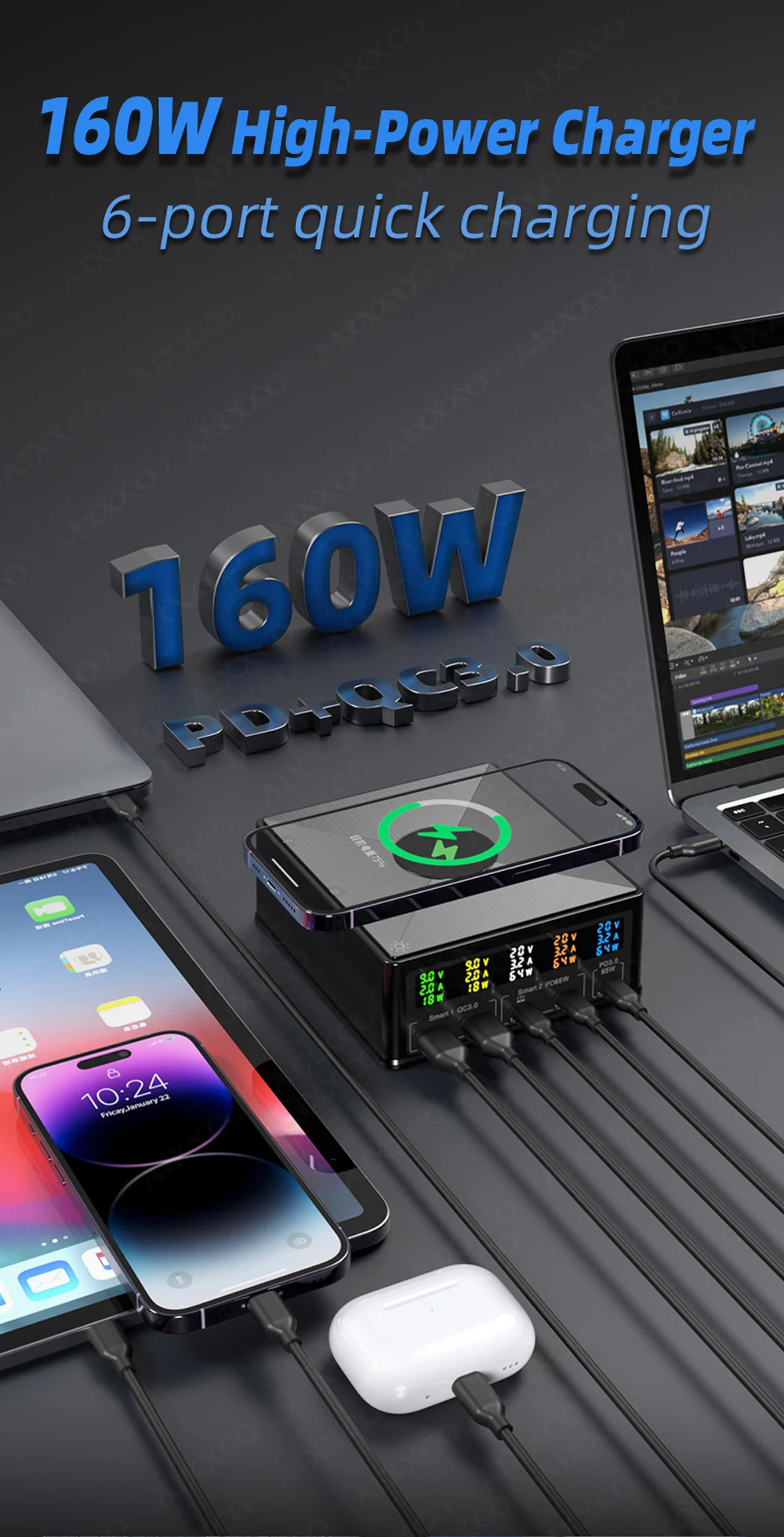 Comprar AIXXCO-estación de carga rápida para iPhone y portátil, cargador GaN de 160W, 3,0 tipo C, PD, USB, con 15W de carga inalámbrica