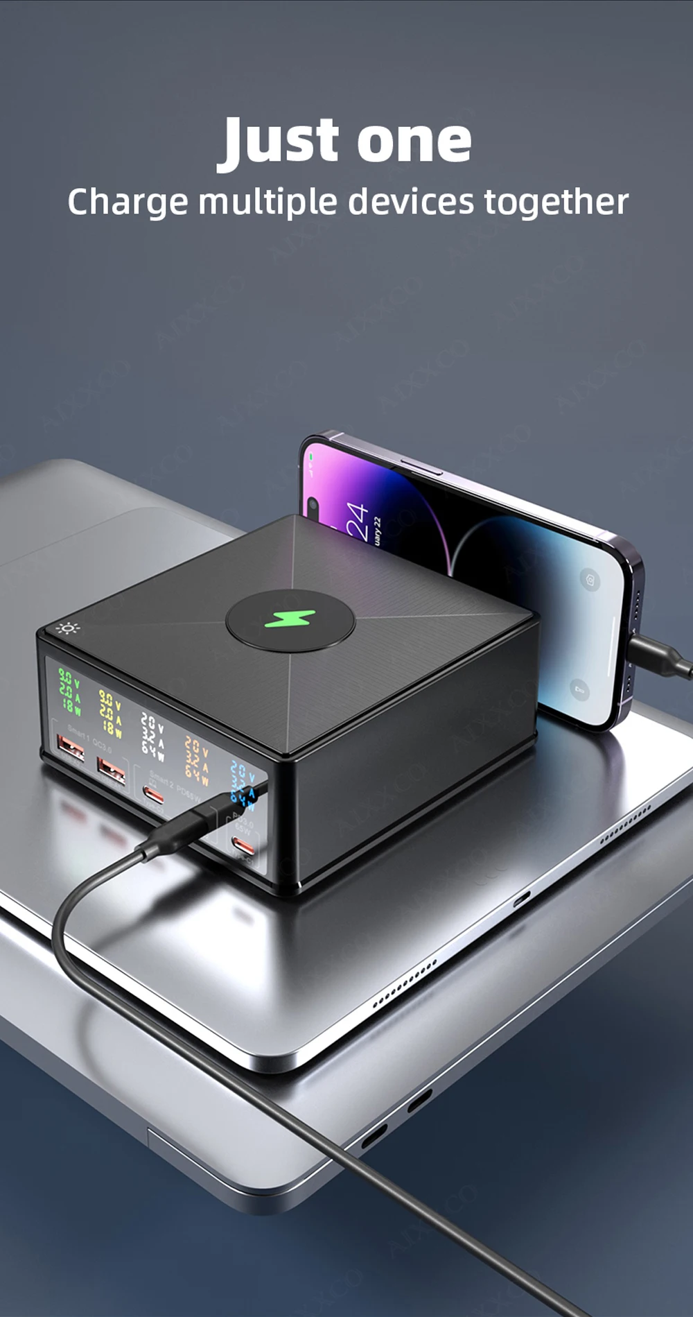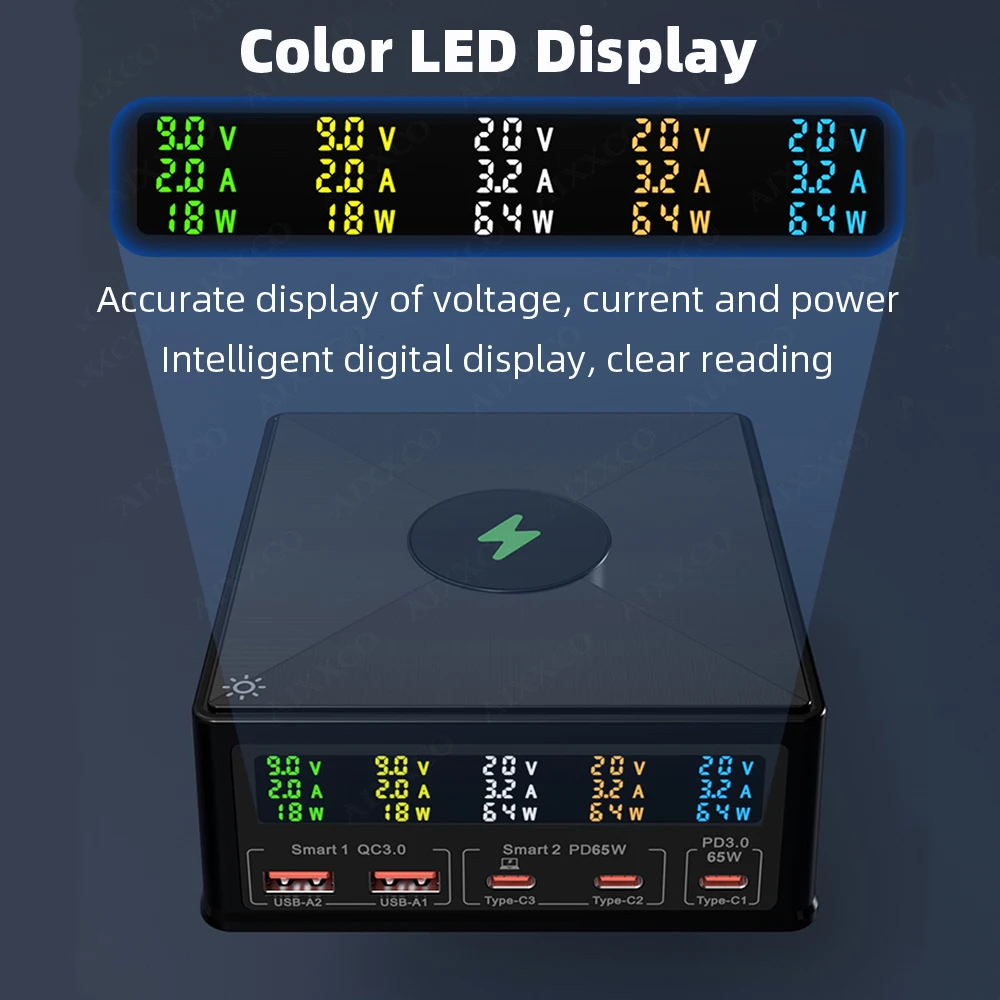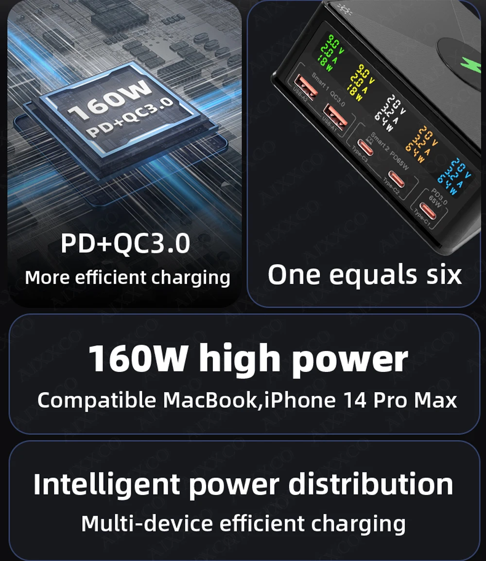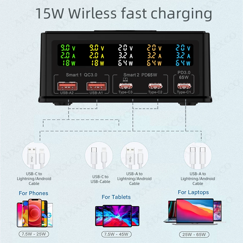 Comprar AIXXCO-estación de carga rápida para iPhone y portátil, cargador GaN de 160W, 3,0 tipo C, PD, USB, con 15W de carga inalámbrica