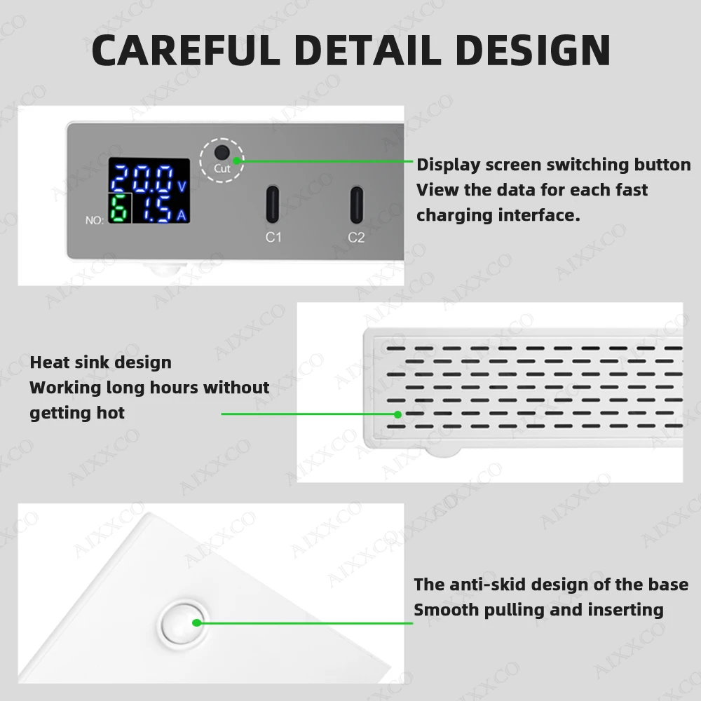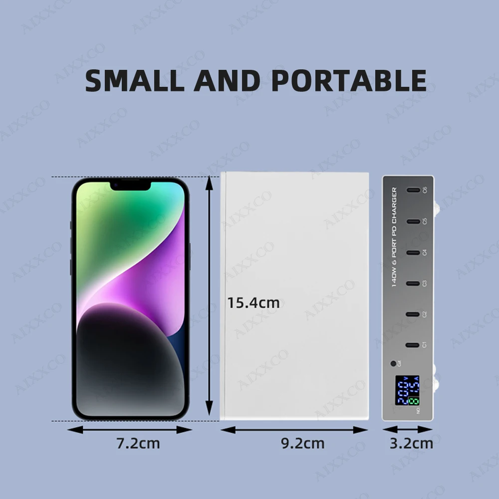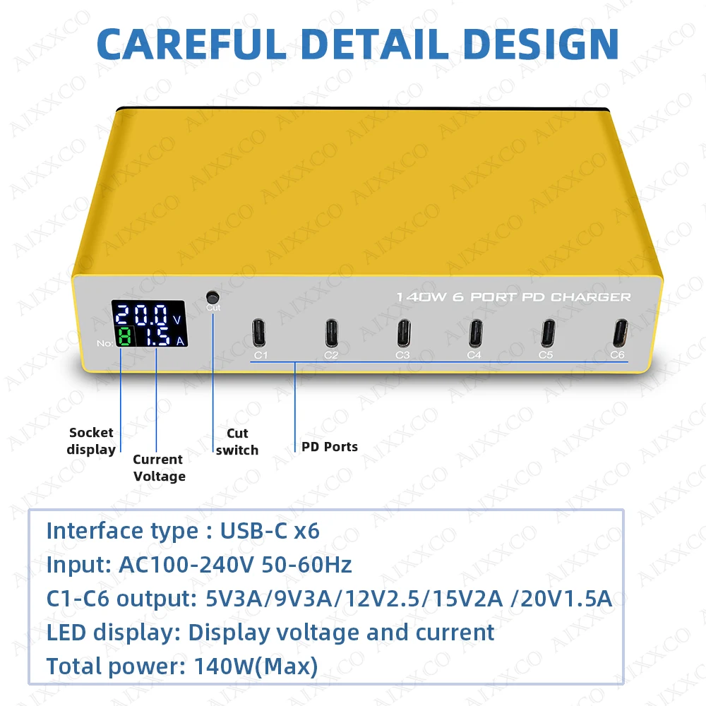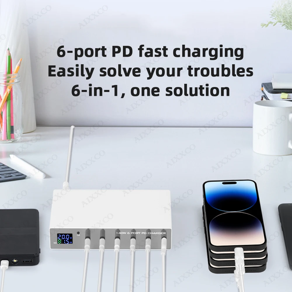 The total power of the product is 140W,and there are six C-port charging ports, which work independently and do not affect each other.