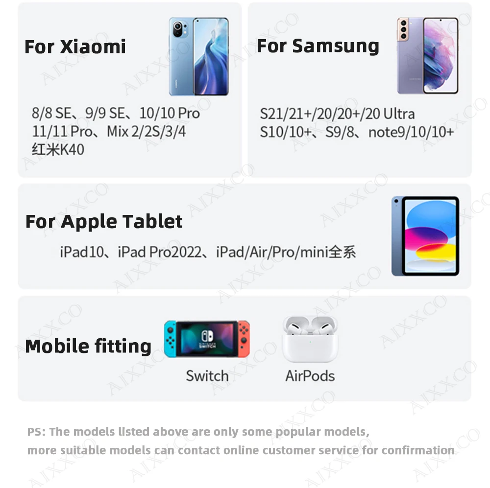 Support for Mobile phone, camera, MP3, Bluetooth headset, game console, smart bracelet, pad and other devices.