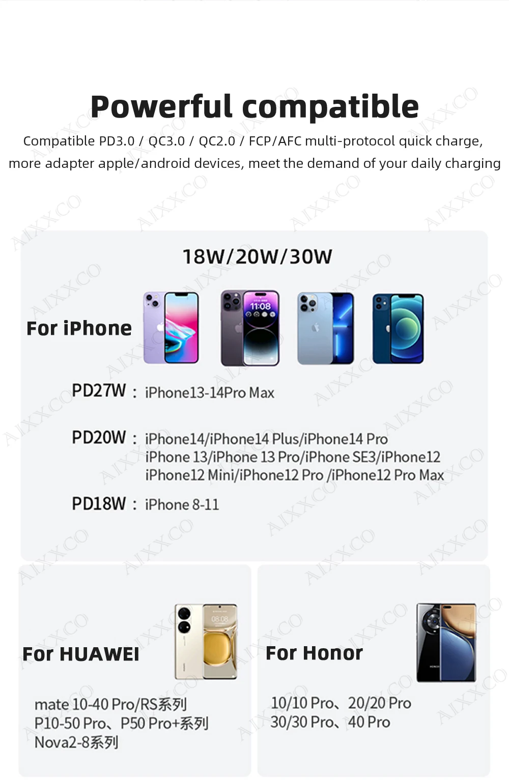 The maximum output power of PD port is 30W,and the output of PD port is 5V3A/9V3A/12V2.5A/15V2A/20V1.5A.