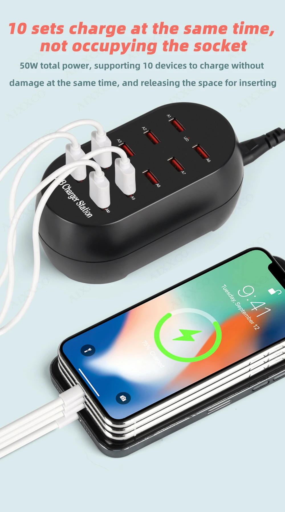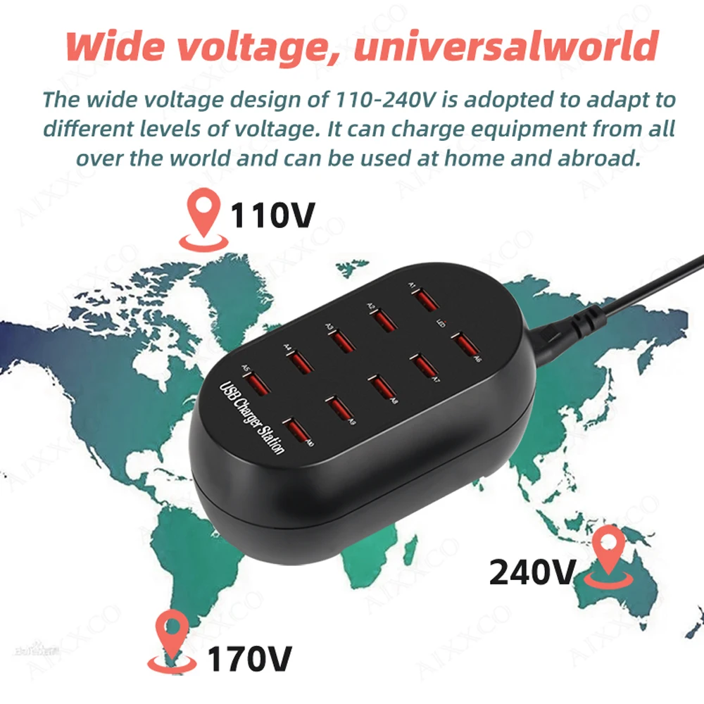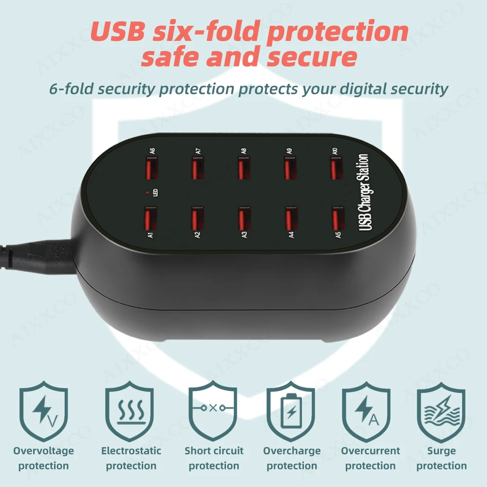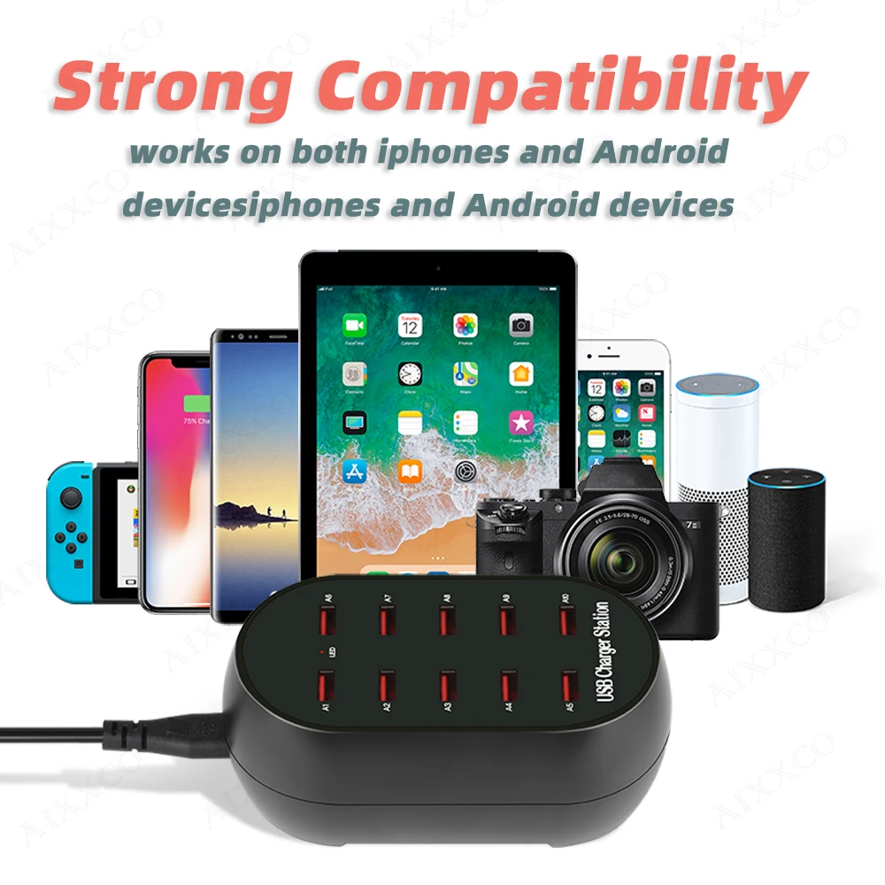 Comprar AIXXCO-estación de carga USB con 10 puertos, cargador multipuerto de 50W/10A para teléfonos móviles y tabletas, múltiples dispositivos