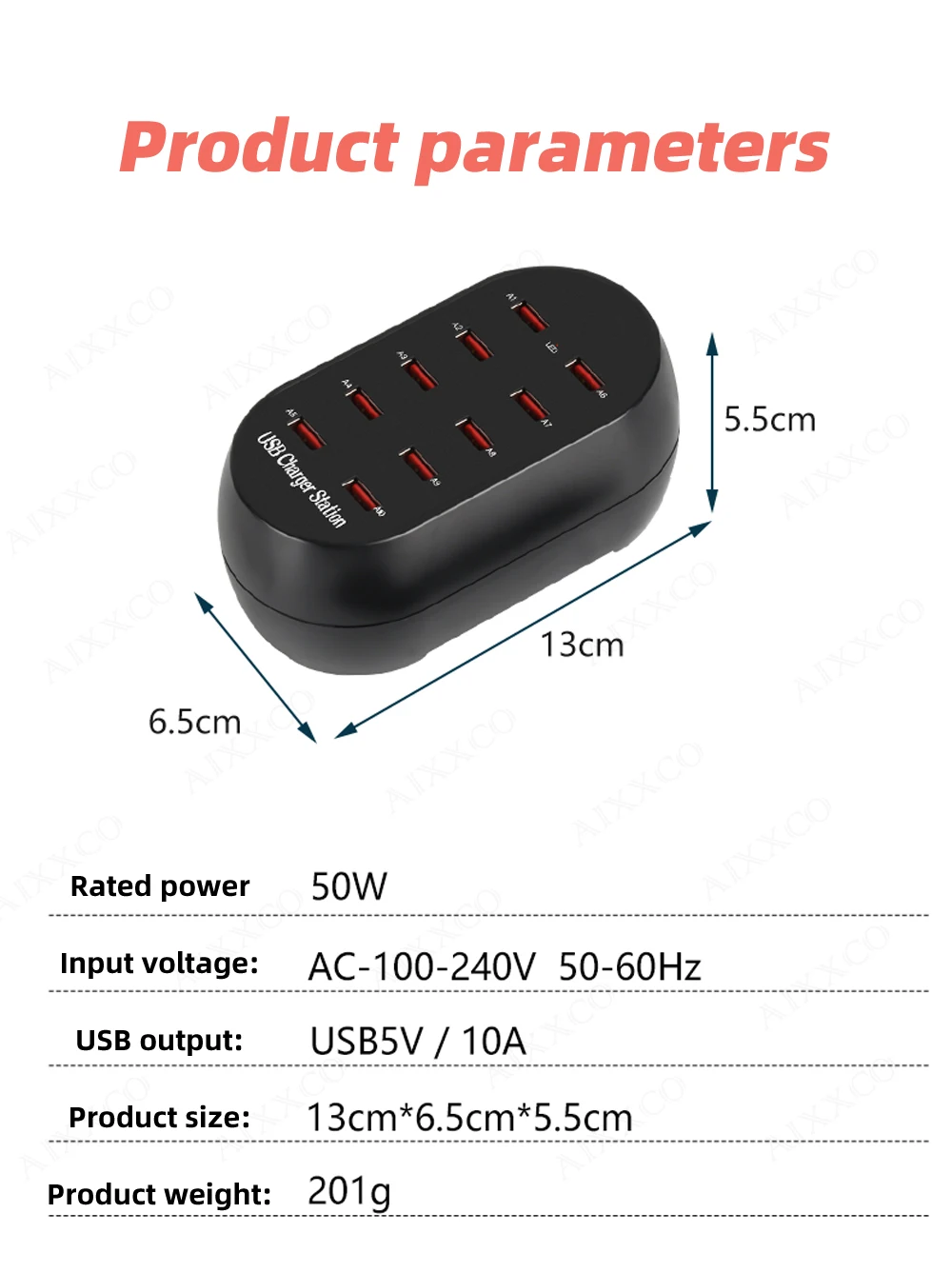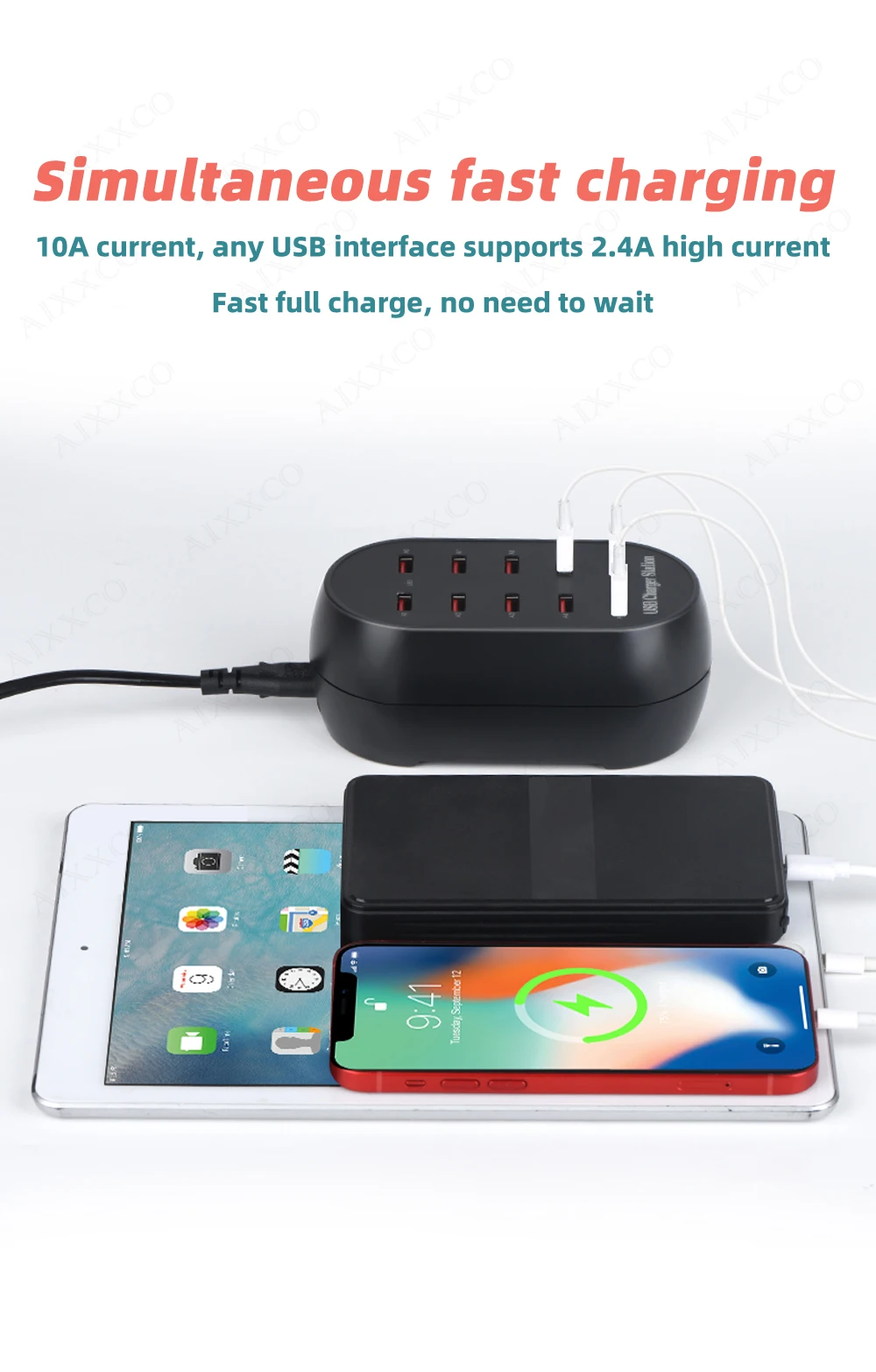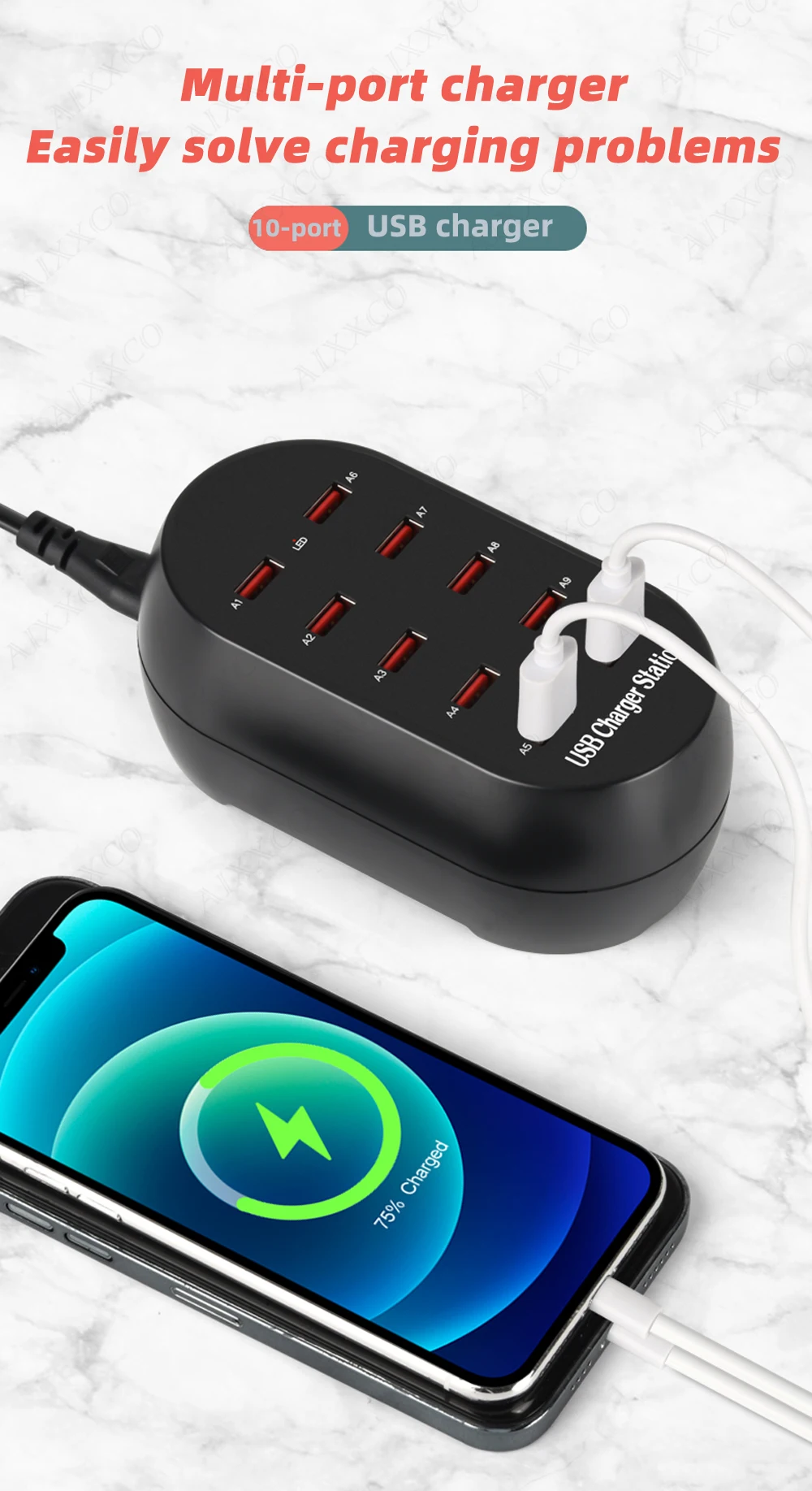 Comprar AIXXCO-estación de carga USB con 10 puertos, cargador multipuerto de 50W/10A para teléfonos móviles y tabletas, múltiples dispositivos