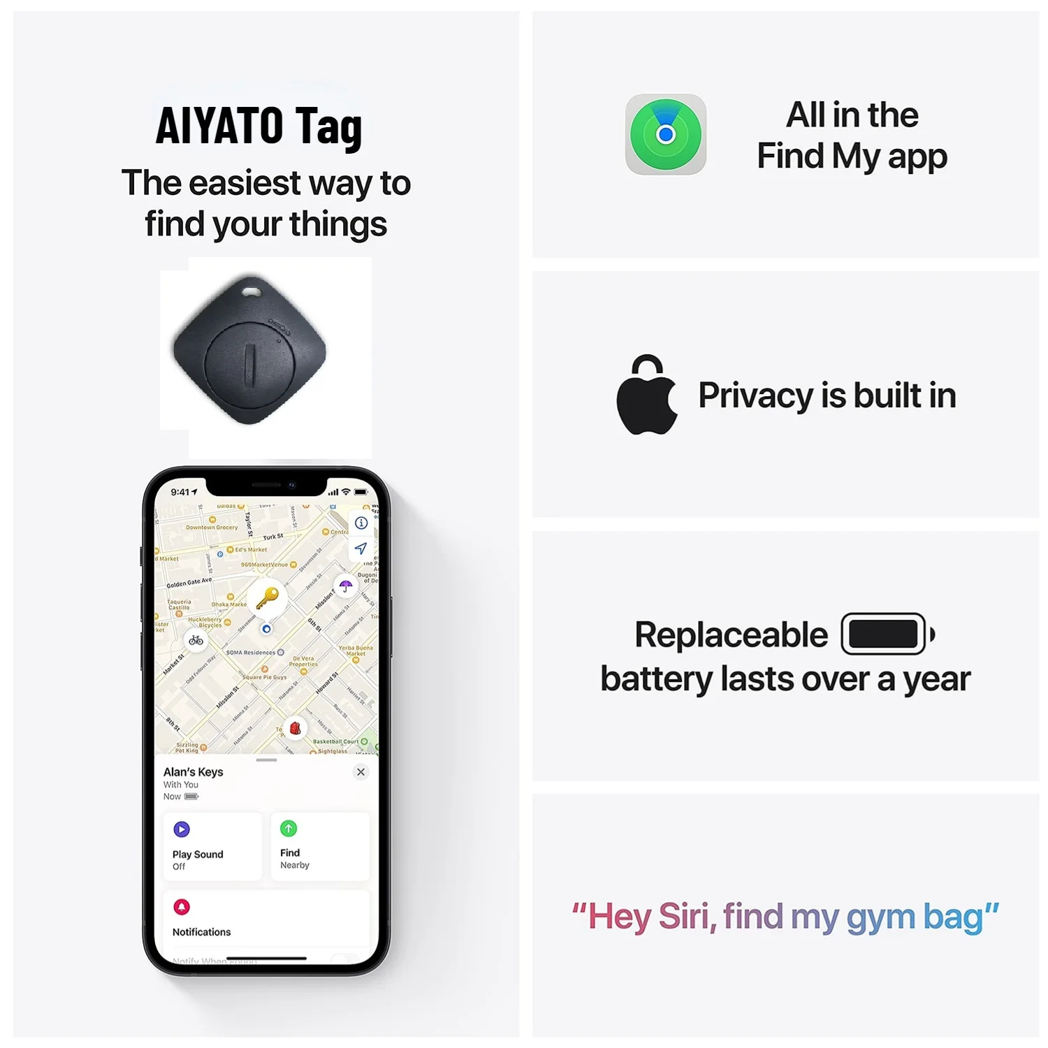 【Easy to Find】 AIYATO Key Finders can play a sound on the built-in speaker or you can ask Siri for help to find it easily. Notify When Left Behind: When out of Bluetooth range, you will be notified of the most recent location of an item. Notify When Found: When your Item Locator is seen by another "Find My" enabled device, you will receive a notification of its updated location.
