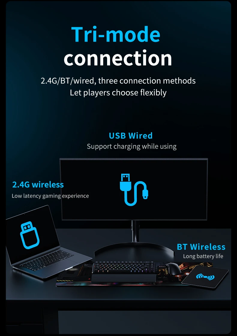 Conexión: Triple modo (2,4G inalámbrico/USB con cable/BT)