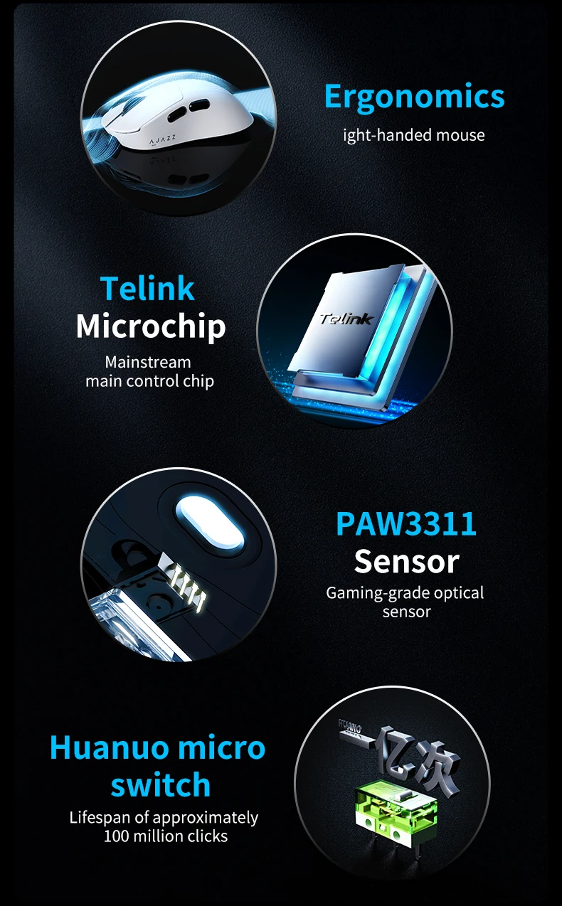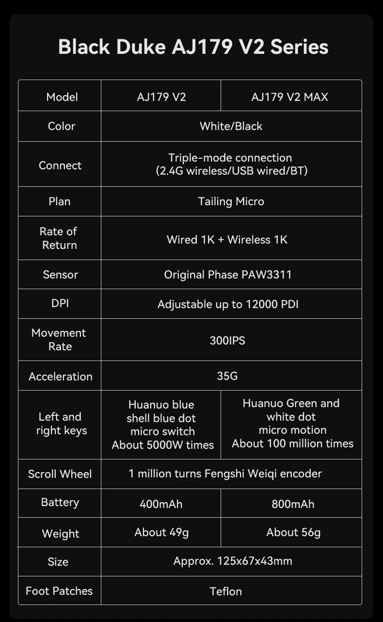 Teclas izquierda y derecha: AJ179 V2 es un microinterruptor de punto azul de carcasa azul Huanuo aproximadamente 5000 W veces, AJ179 V2 MAX es un micro movimiento de punto verde y blanco Huanuo aproximadamente 100 millones de veces