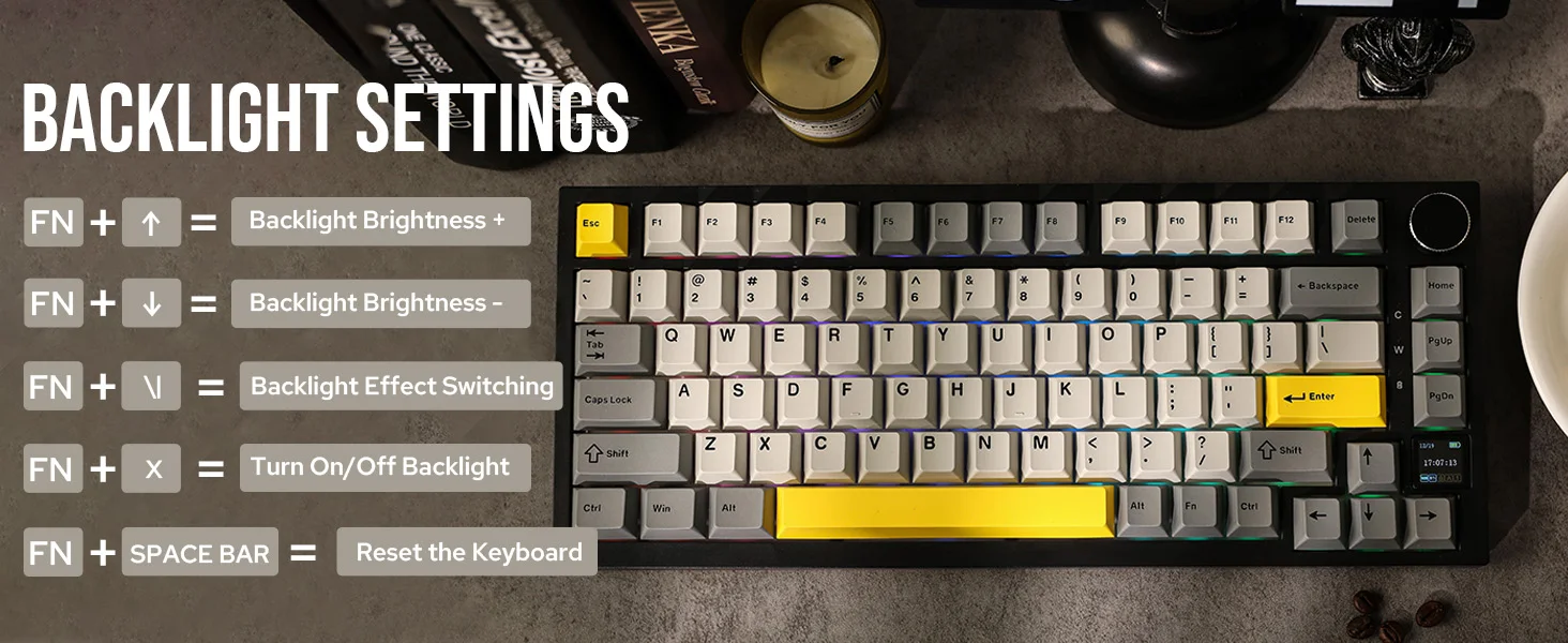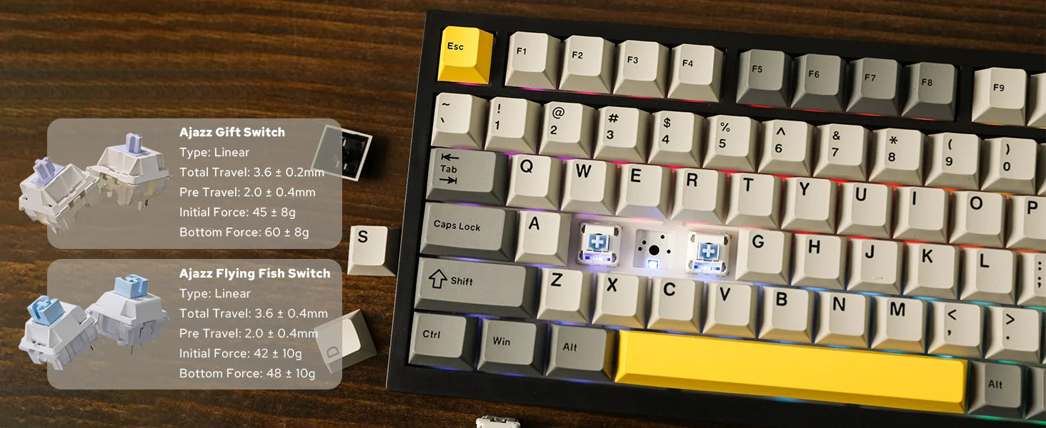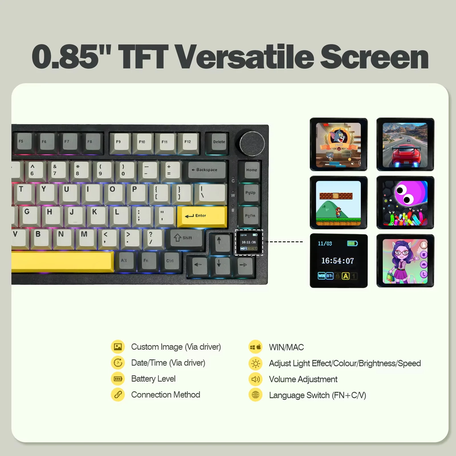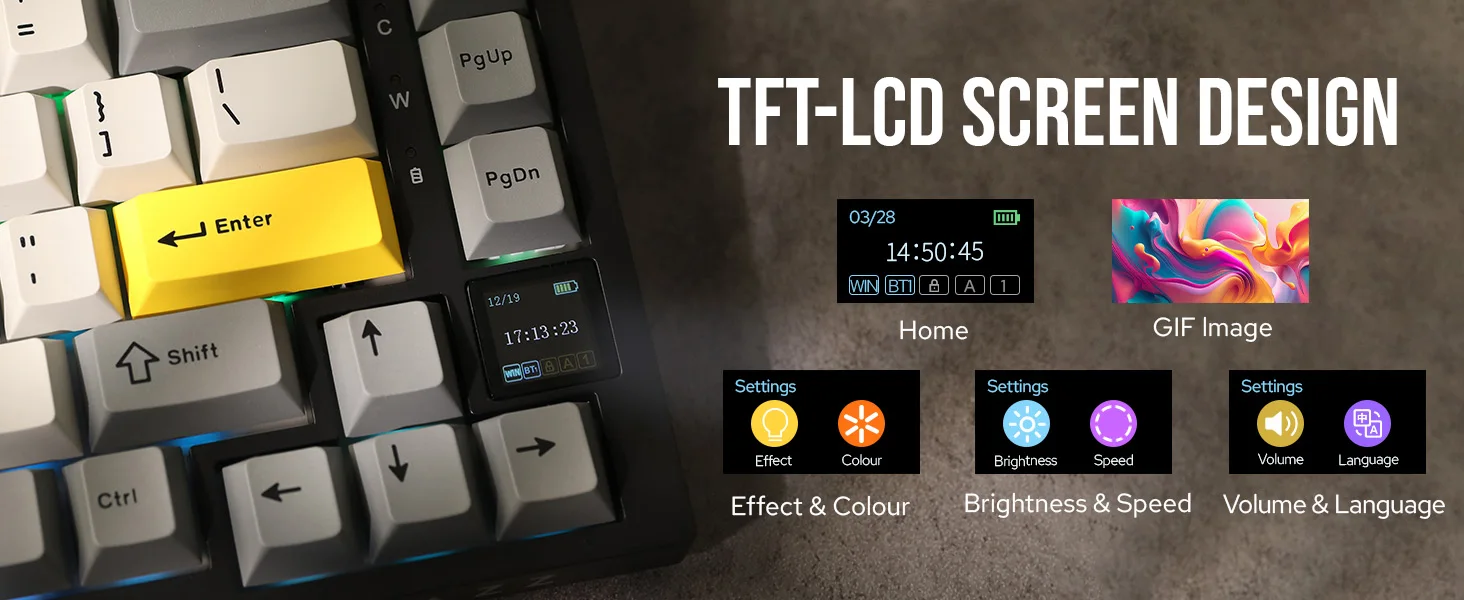 Este teclado mecánico al 75% viene equipado con una pantalla TFT, que sirve como interfaz interactiva para actualizaciones y personalización en tiempo real.La pantalla de alta definición permite imágenes personalizables, estado de la batería, visualización de fecha y hora, visualización de conectividad y sistema operativo y efectos de retroiluminación.Con esta desglose de la función de pantalla TFT, es fácil comprender toda la gama de sus capacidades y por qué el Ajazz AK820 Pro se destaca de otros teclados del mercado.