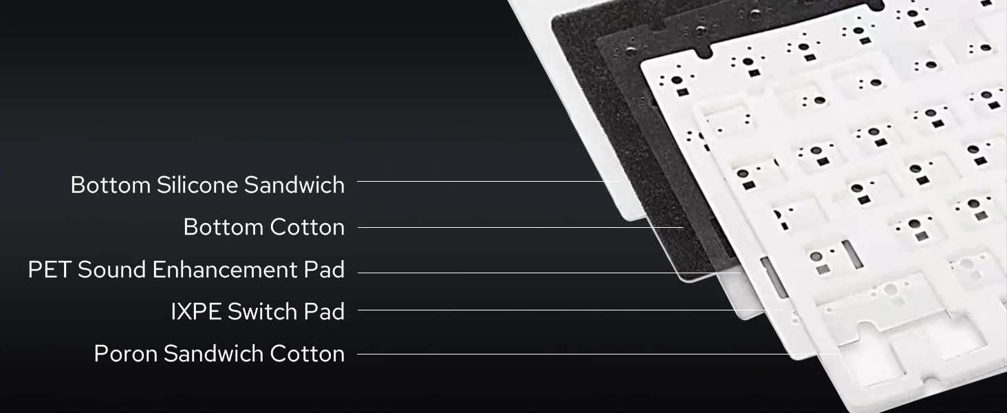 Amortiguación de sonido: 5 capas: almohadilla para sándwich Poron, almohadilla para interruptor IXPE, almohadilla para mejorar el sonido de PET, espuma inferior y silicona inferior.