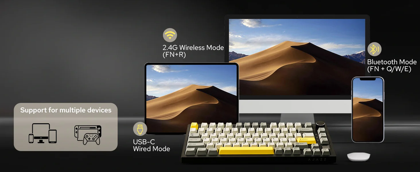 El Ajazz AK820 Pros admite conexión vía Bluetooth o 2,4 GHz para conectividad inalámbrica, o con el cable USB tipo C incluido.Con Bluetooth 5.1, el teclado responde más rápido y ahorra más energía que las versiones anteriores de Bluetooth.El teclado también se cambia fácilmente entre los tres modos para realizar múltiples tareas de manera eficiente y un rendimiento rápido.La batería de 4000 mAh incluida garantiza un uso prolongado y estable, sin preocuparse por un cortocircuito.