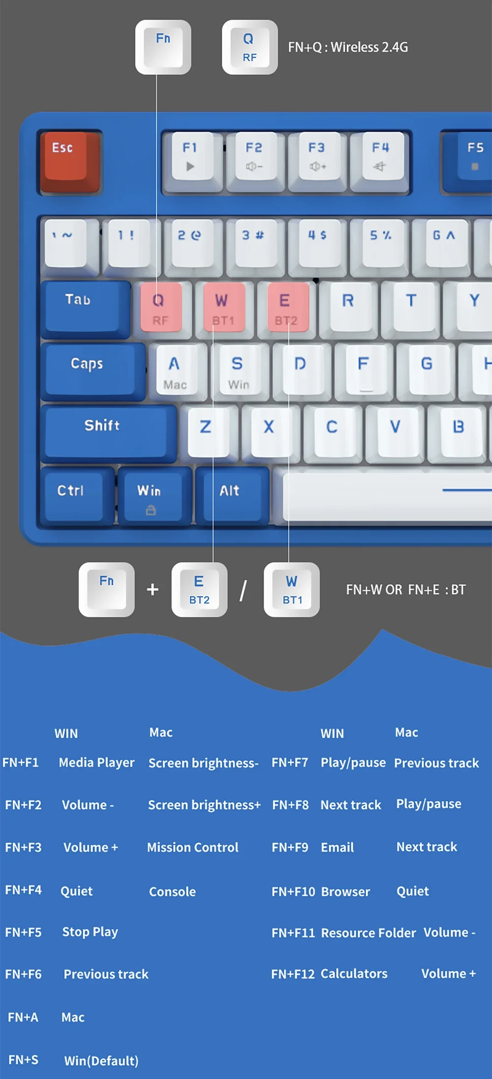 El teclado funciona según lo previsto. Los interruptores azules con buen sonido y una buena conexión inalámbrica se adaptan a todo lo que necesitaba.
