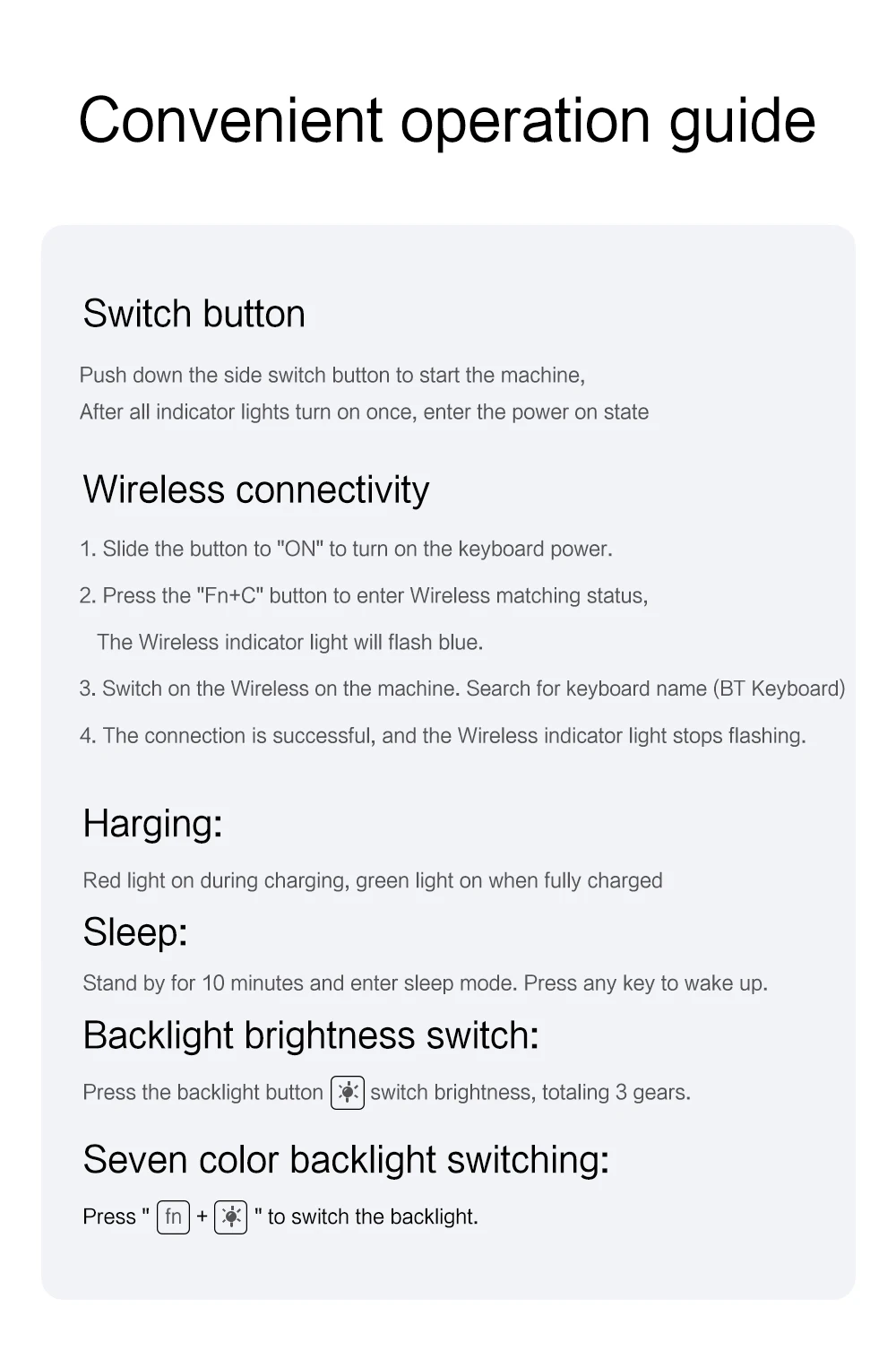 【Nota】Método de conexión Bluetooth: encienda el interruptor del teclado, luego mantenga presionado Fn+C durante aproximadamente 2-3 segundos para iniciar Bluetooth, luego encienda el dispositivo Bluetooth de su tableta, busque"Teclado BT",y haga clic en conectar para conectar 。