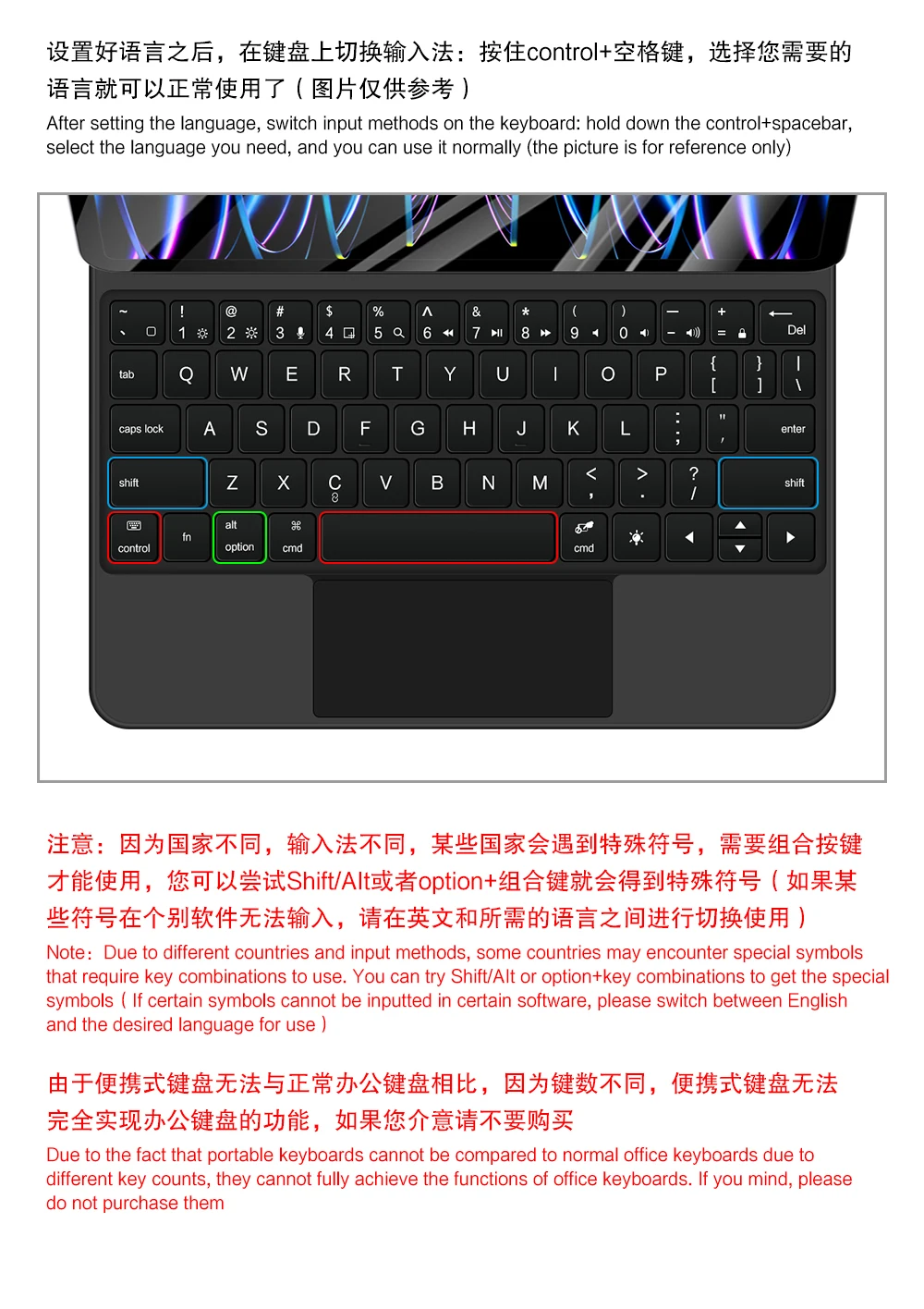 El núcleo del teclado es predeterminado en inglés y los caracteres grabados en el teclado son solo una pantalla Surface.Entonces, en algunos países, incluso si se cambia el método de entrada, los símbolos especiales no corren necesariamente con el diseño de la función del teclado (puede mantener presionada la combinación Shift).Si le importa, ¡no compre!.