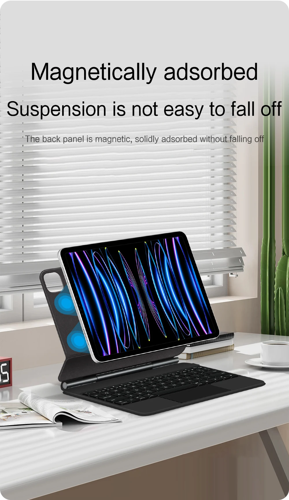 Separación magnética, retroiluminación, panel táctil, soporte multiángulo, conexión inalámbrica Bluetooth