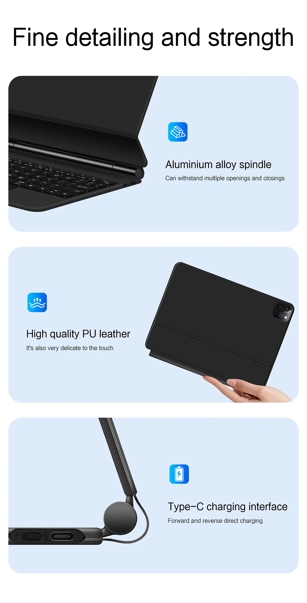 Nota: Debido al gran tamaño de la tableta, si el ángulo del teclado se ajusta demasiado durante el uso, el teclado puede inclinarse.Esta es una situación normal, no entre en pánico, simplemente ajuste la amplitud del teclado y no afectará el uso.