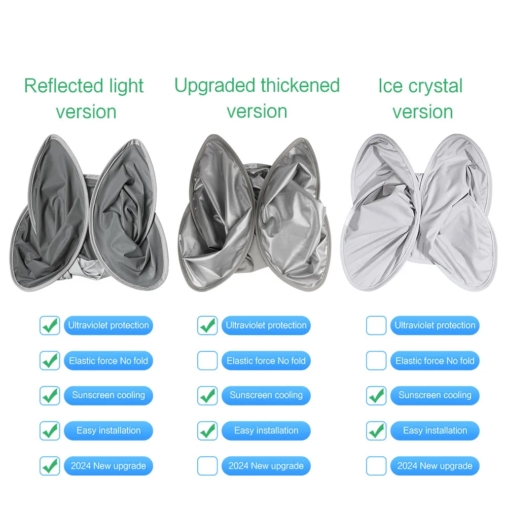 Este parasol AJIUYU para coche está perfectamente instalado y hecho de excelentes materiales. La tela es un material de aislamiento de doble cara de cristal de hielo mejorado dos en uno, y el marco está hecho de tecnología de enfriamiento de metal, que es duradera y resistente a altas temperaturas, con un excelente efecto de aislamiento.