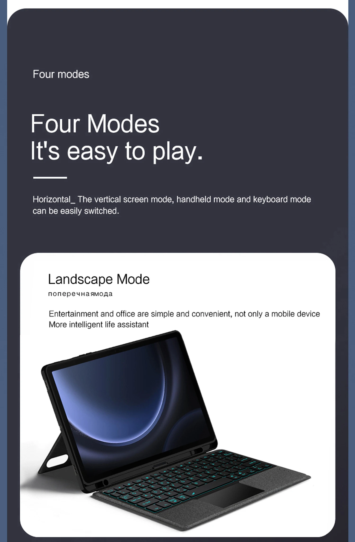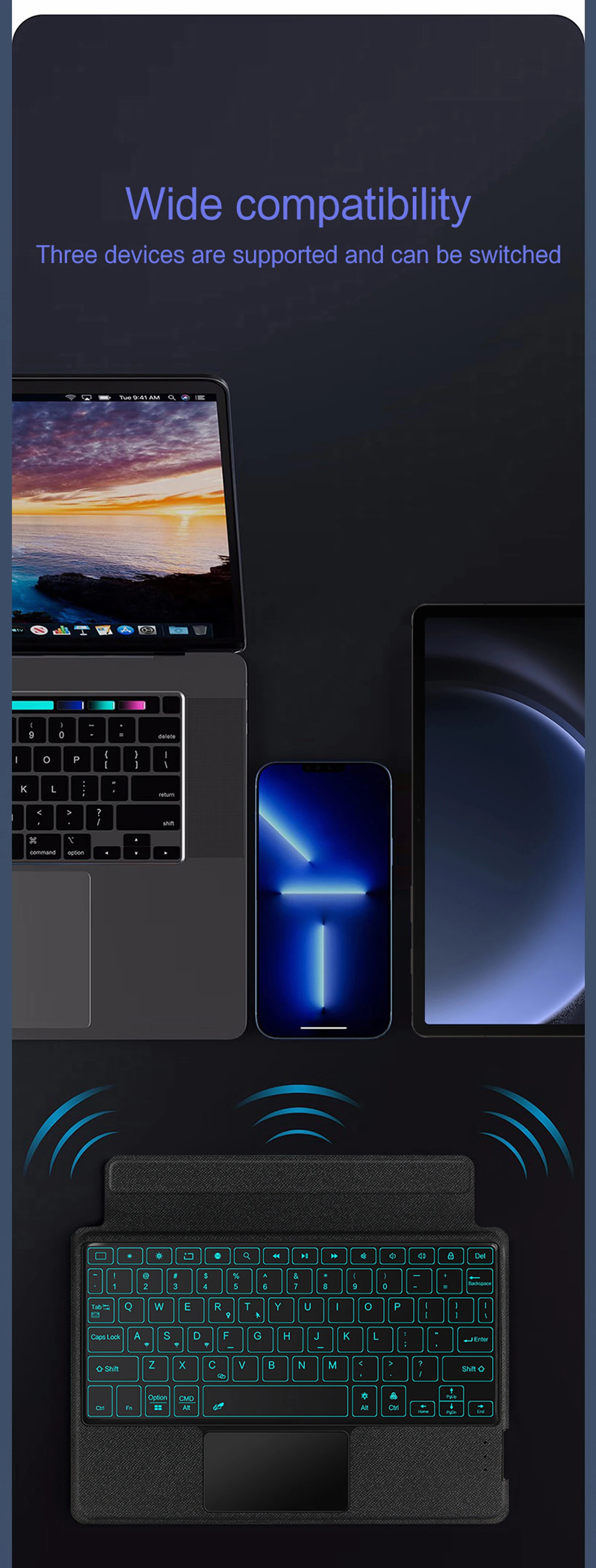 Bluetooth connection, with touch pad, with backlight,Horizontal and vertical support.