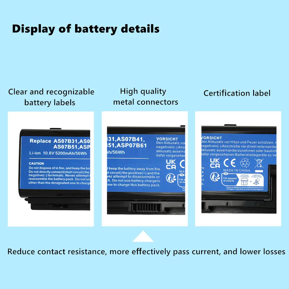 Esta batería para computadora portátil puede reemplazar los siguientes números de pieza:Para Acer AS07B31 AS07B32 AS07B41 AS07B42 AS07B51 AS07B52 AS07B61 AS07B71 AS07B72
