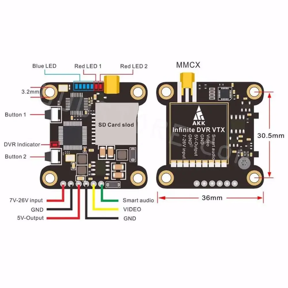 EnAKK'sEl más nuevo VTX que tiene DVR incorporado, audio, hasta 6S (7 - 26v) directoLipoEntrada, salida de potencia ajustable (25, 200, 600 y 1000 mW) con modo Pit y salida de potencia de cámara de 5V.