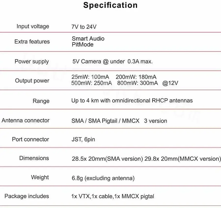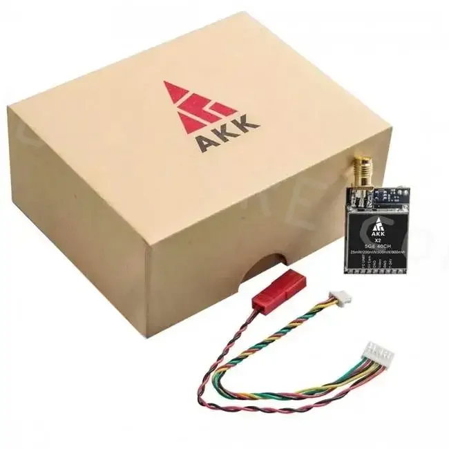AKK X2-MX MMCX 200mW/500mW/800mW 5,8GHz 37CH FPV Transmisor con Audio OSD PIT ModoCaracterísticas25mW/200mW/500mW/800mW potencia conmutableEntrada de 7-24 V y puede proporcionar salida de 5 V para su cámara.Puede filtrar la energía y asegurarse de obtener un vídeo limpio.Tamaño súper mini y peso ligero, frecuencia de un botón y configuración de energía.Admite modo PIT y funciona con Betaflight, controlador de vuelo, OSDEspecificaciones:Voltaje de entrada: 7V-24VFuente de alimentación: Cámara de 5 V a menos de 0,3 A máx.Potencia de salida: 25mW: 100mA200 mW: 180 mA500 mW: 250 mA800 mW: 300 mA a 12 VAlcance: Hasta 4 con antenas RHCP omnidireccionalesConector de puerto: JST, 6 pinesConector de antena: MMCXEl paquete incluye:1 transmisor MMCX de 5,8 G, 200 mW/500 mW/800 mW1 cable.1x manual del producto