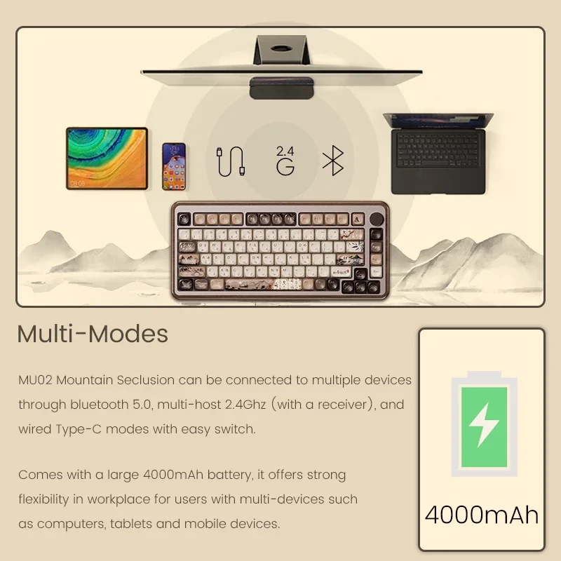 MU01 Mountain Seclusion se puede conectar a múltiples dispositivos a través de bluetooth 5.0, multihost de 2,4 Ghz (con receptor) y modos tipo C cableados con fácil cambio.