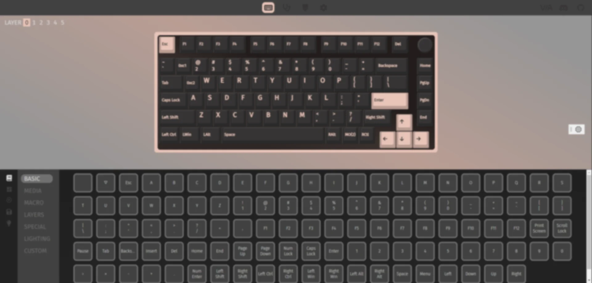 Cree efectos de iluminación personalizados con la configuración VIA, proporcionando una gama de colores, brillo ajustable y velocidad de animación.