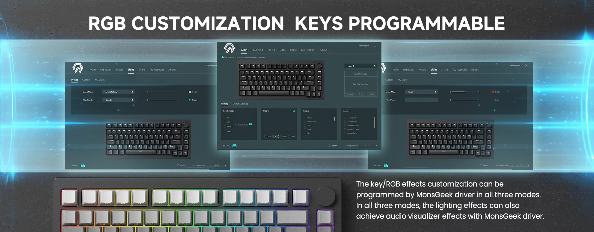 La personalización de las teclas/efectos de iluminación se puede programar mediante el controlador MonsGeek en los tres modos.