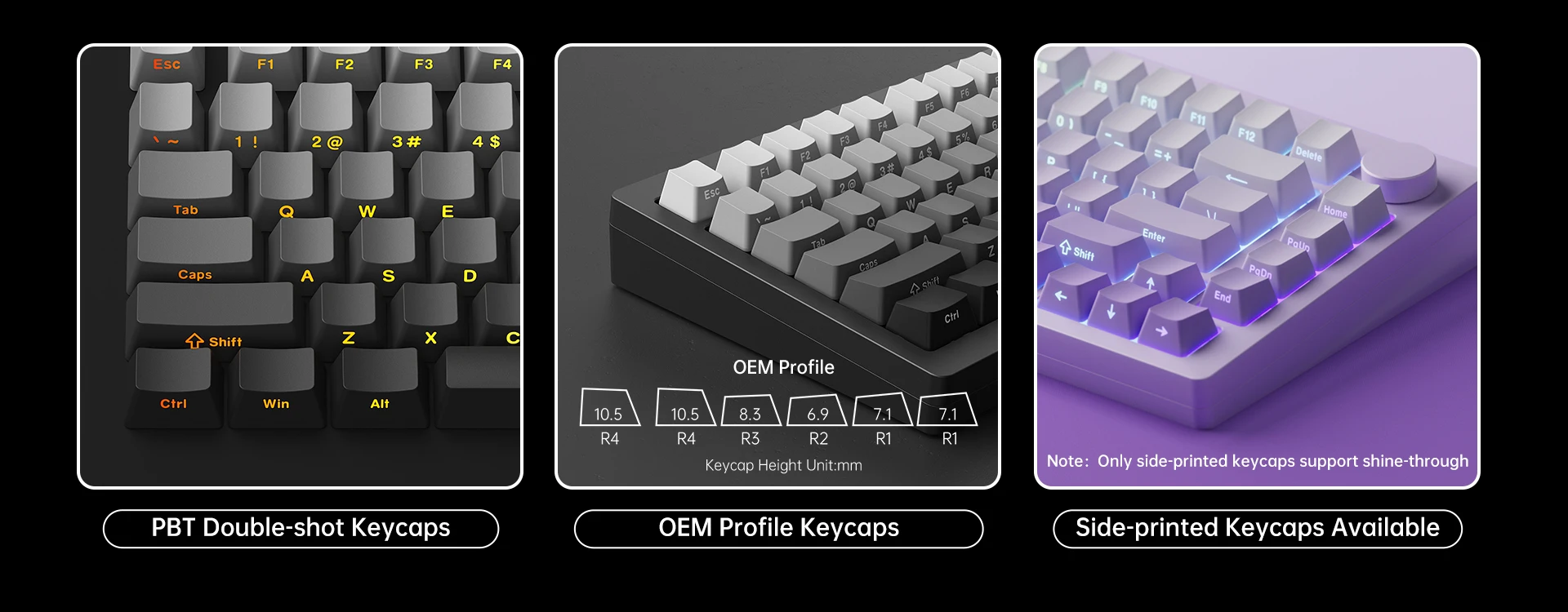 Las teclas de perfil OEM están diseñadas para brindar la máxima comodidad, manteniendo la mano en un estado natural para minimizar la fatiga de la mano después de un uso prolongado y ayudar a los usuarios a minimizar los tipos.