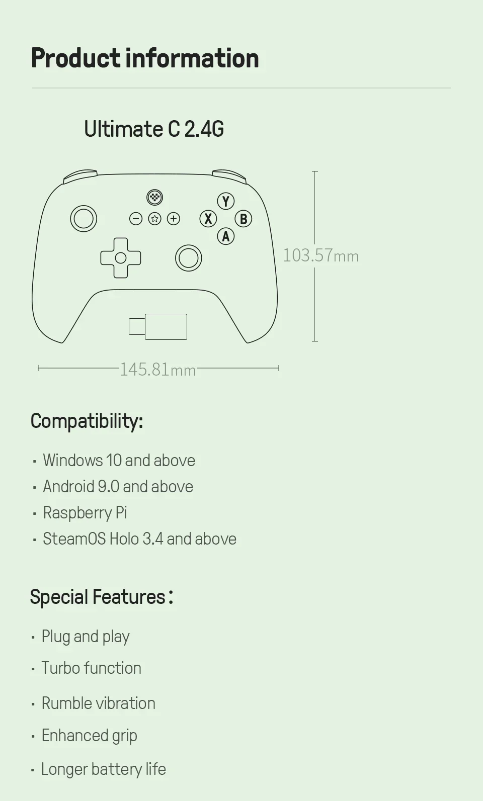 Diseñamos el controlador Ultimate C 2,4g para que sea una versión aún más rentable y simplificada de Ultimate. Mismo 8BitDo Ultimate calidad de construcción con un precio aún más alto. Disponible en verde pastel y morado con el mismo agarre mejorado.
