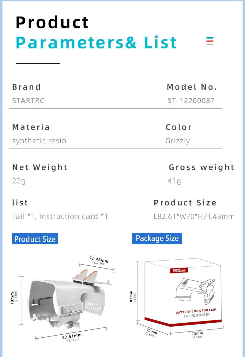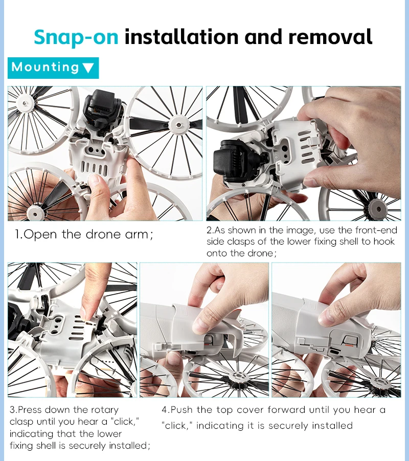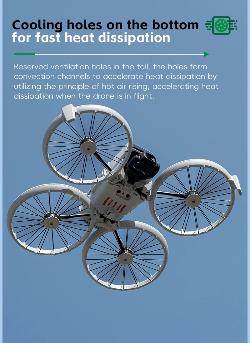 4.Fácil de usar, diseño de hebilla dividida, al fijar la parte inferior en la parte superior de la hebilla, ya sea instalación y desmontaje, no hay necesidad de pasos engorrosos y las salidas de aire reservadas en la cola no afectarán la disipación de calor de el dron al volar.