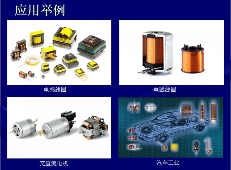 Uso: ampliamente utilizado en instrumentos electrónicos domésticos y compactos, telecomunicaciones, instrumentos, transformadores de alta frecuencia, bobinas de inductor, relés, motores y bobinas de medidor.