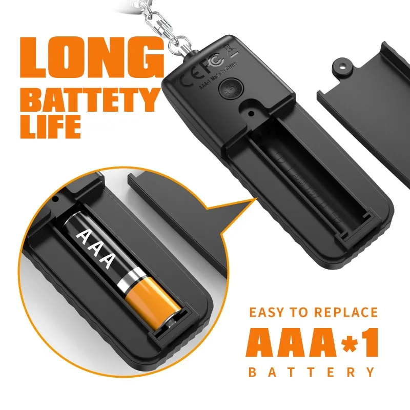 2: Función de alarma: cuando se retira el llavero, el producto emitirá un sonido de alarma de 130 dB y la luz LED parpadeará.Empuje hacia atrás el pasador para detenerlo.Un sonido de alarma fuerte puede atraer la atención de los demás y buscar ayuda en situaciones de emergencia.