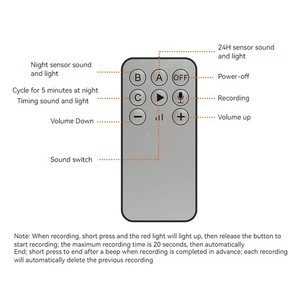 Modo A: sensor de sonido y luz de 24 horas; Modo B: Sonido y luz del sensor nocturno; Modo C: ciclo de luz y sonido cronometrado de 5 minutos por la noche