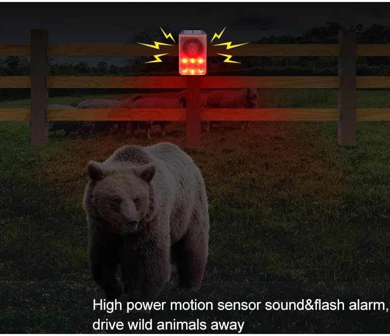 Comprar Alarma de Sensor de movimiento Solar para exteriores con Control remoto, 129dB, Detector de movimiento para granja, Patio, jardín, cobertizo de garaje