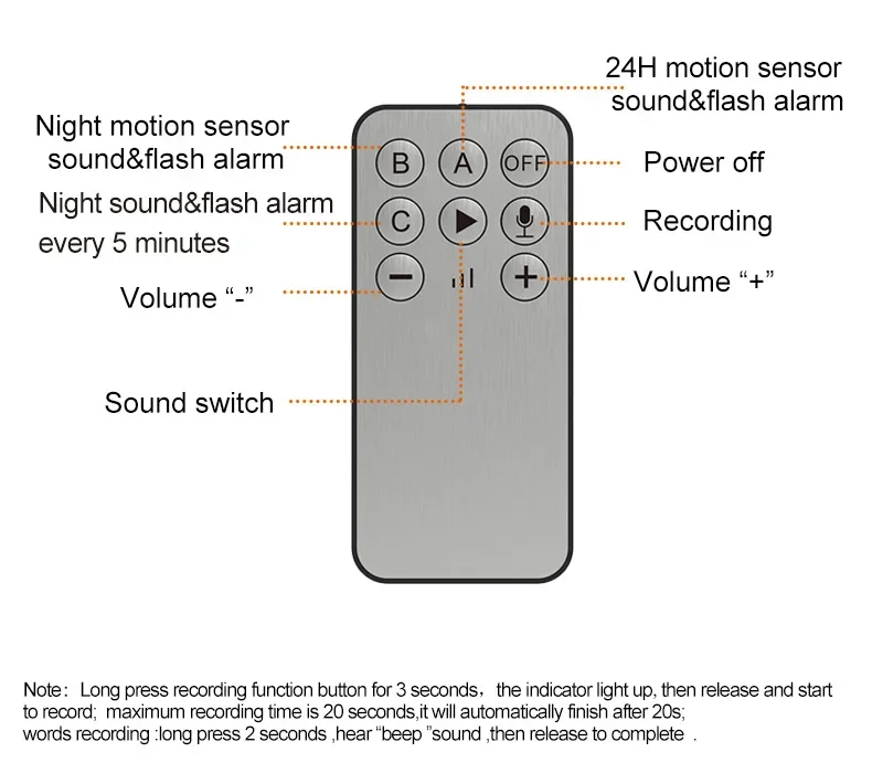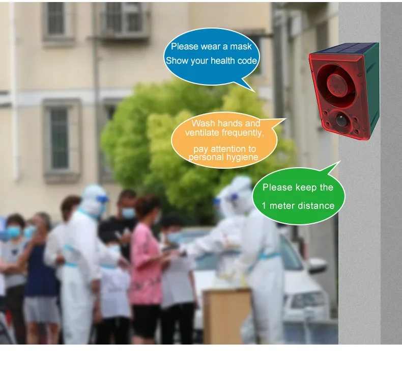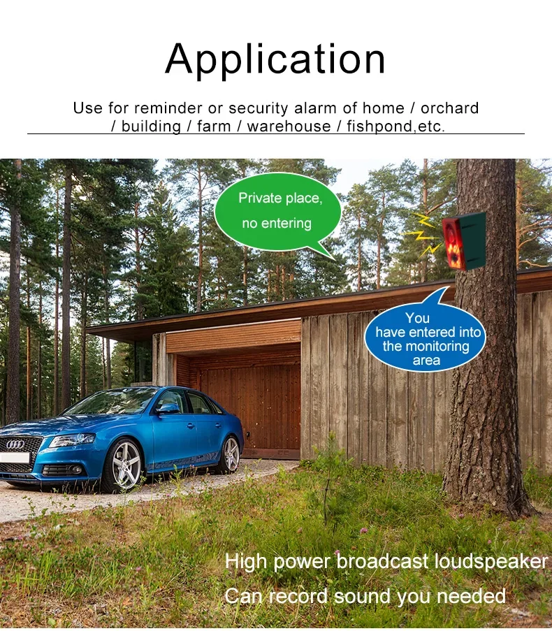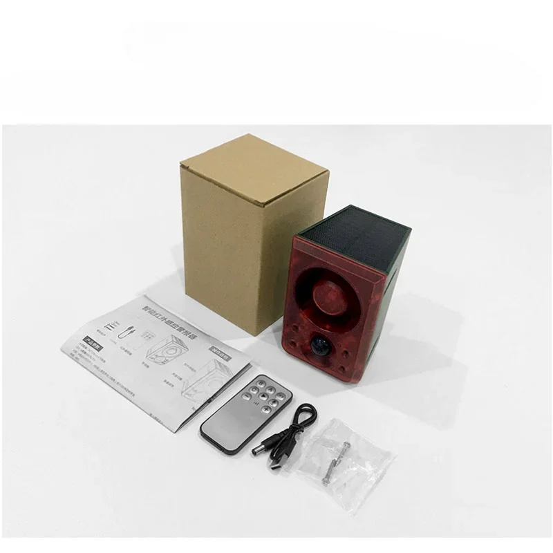Alarma de sensor de movimiento solar para exteriores con control remoto 129DB con detector de movimiento para cobertizo de garaje de jardín de Patio de granjaDescripción:Tamaño del producto: 88*85*140mmPanel solar: panel solar de polisilicio de 5V * 120mALED: LED rojo de destello de 6 piezasModo A: sonido del sensor de movimiento 24H y alarma de Flash, modo B: sensor de movimiento nocturnoInterruptorAlarma de sonido y Flash, modo C: sonido nocturno y alarma de flash cada 5 minutosMaterial:ABSGrabaciónPuede repetir la grabación, una vez que grabe durante 20 segundos como máximo, repita para reproducir dos vecesTiempo de carga: energía solar 10 horas, carga CC 2 horas (5V CC * 1A).TimeMode DE TRABAJO A & B sensor de movimiento Flash y alarma 100 veces, modo C 12 horasAltavoz de transmisión de potencia de luz, repite para grabar 20 segundosVolumenVolumen ajustable de 3 nivelesBattery3.7V * 1200mAH Batería de litioMovimiento (afectado por la temperatura ambiente).Distancia remota 10MCaja de embalaje Kraft, 15*10*9,7 cm, 0,37 KG/pcTamaño del cartón: 50*40*46cm,60/CTN, 23,5 kg/CTNDistancia de control remoto: control remoto infrarrojo 10 metros