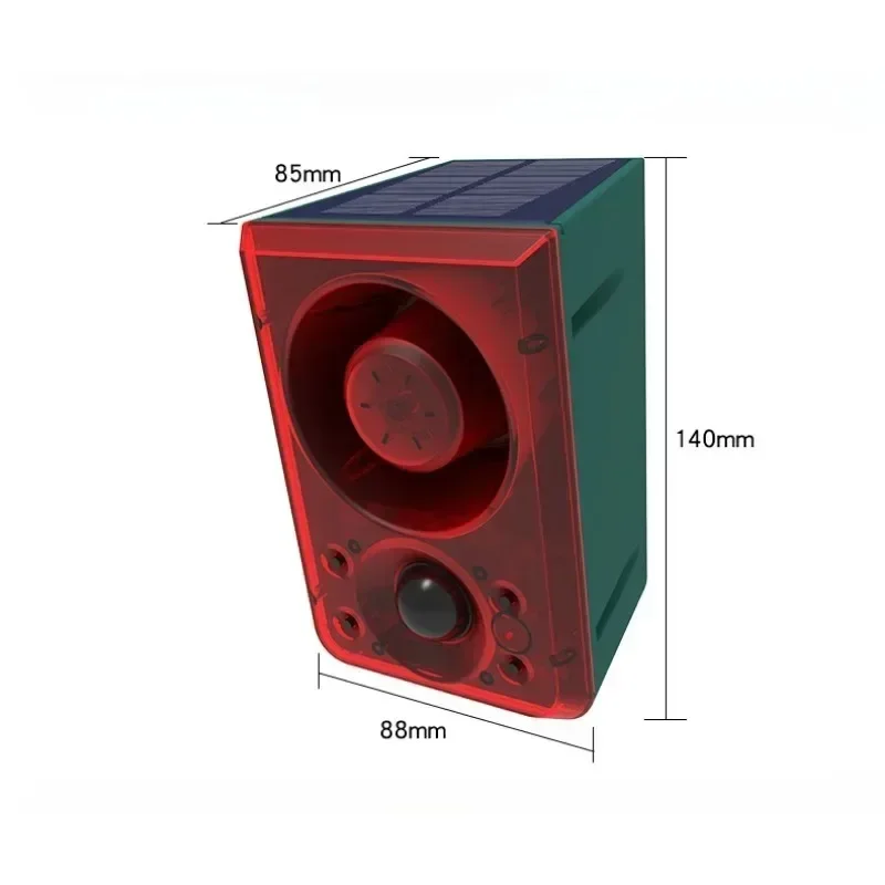 Alarma de sensor de movimiento solar para exteriores con control remoto 129DB con detector de movimiento para cobertizo de garaje de jardín de Patio de granjaDescripción:Tamaño del producto: 88*85*140mmPanel solar: panel solar de polisilicio de 5V * 120mALED: LED rojo de destello de 6 piezasModo A: sonido del sensor de movimiento 24H y alarma de Flash, modo B: sensor de movimiento nocturnoInterruptorAlarma de sonido y Flash, modo C: sonido nocturno y alarma de flash cada 5 minutosMaterial:ABSGrabaciónPuede repetir la grabación, una vez que grabe durante 20 segundos como máximo, repita para reproducir dos vecesTiempo de carga: energía solar 10 horas, carga CC 2 horas (5V CC * 1A).TimeMode DE TRABAJO A & B sensor de movimiento Flash y alarma 100 veces, modo C 12 horasAltavoz de transmisión de potencia de luz, repite para grabar 20 segundosVolumenVolumen ajustable de 3 nivelesBattery3.7V * 1200mAH Batería de litioMovimiento (afectado por la temperatura ambiente).Distancia remota 10MCaja de embalaje Kraft, 15*10*9,7 cm, 0,37 KG/pcTamaño del cartón: 50*40*46cm,60/CTN, 23,5 kg/CTNDistancia de control remoto: control remoto infrarrojo 10 metros