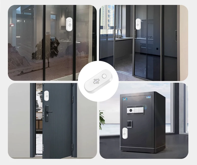 Ubicaciones de instalación comunes: ventanas de vidrio, puertas de vidrio, puertas de madera, cajas fuertes y cualquier otro lugar donde se requiera detección de vibraciones.