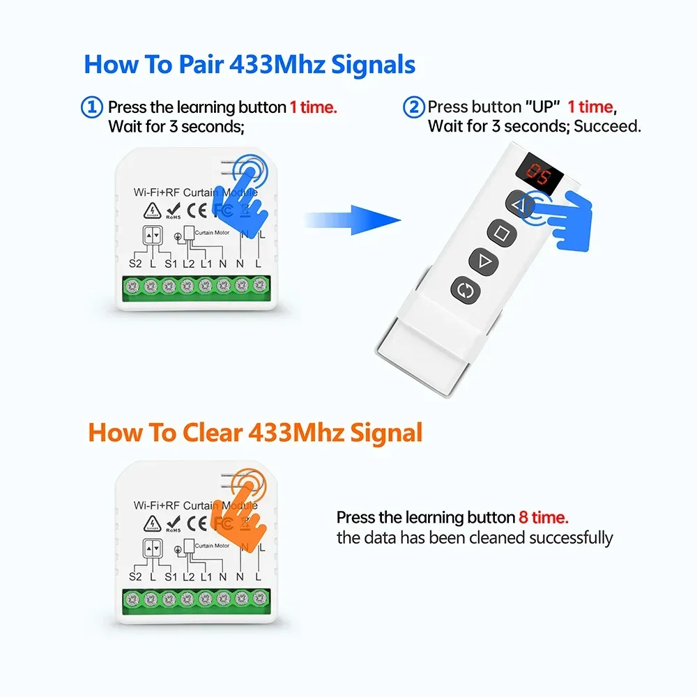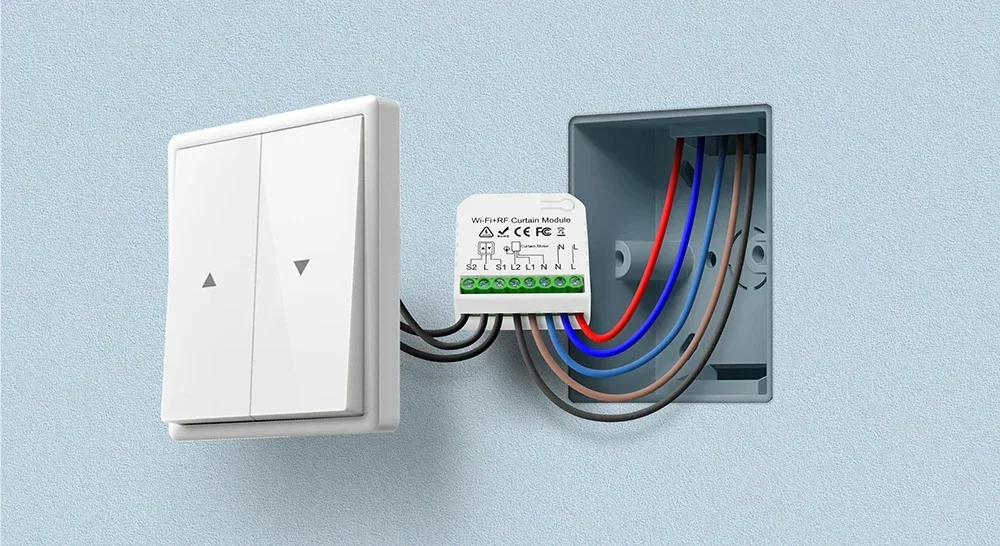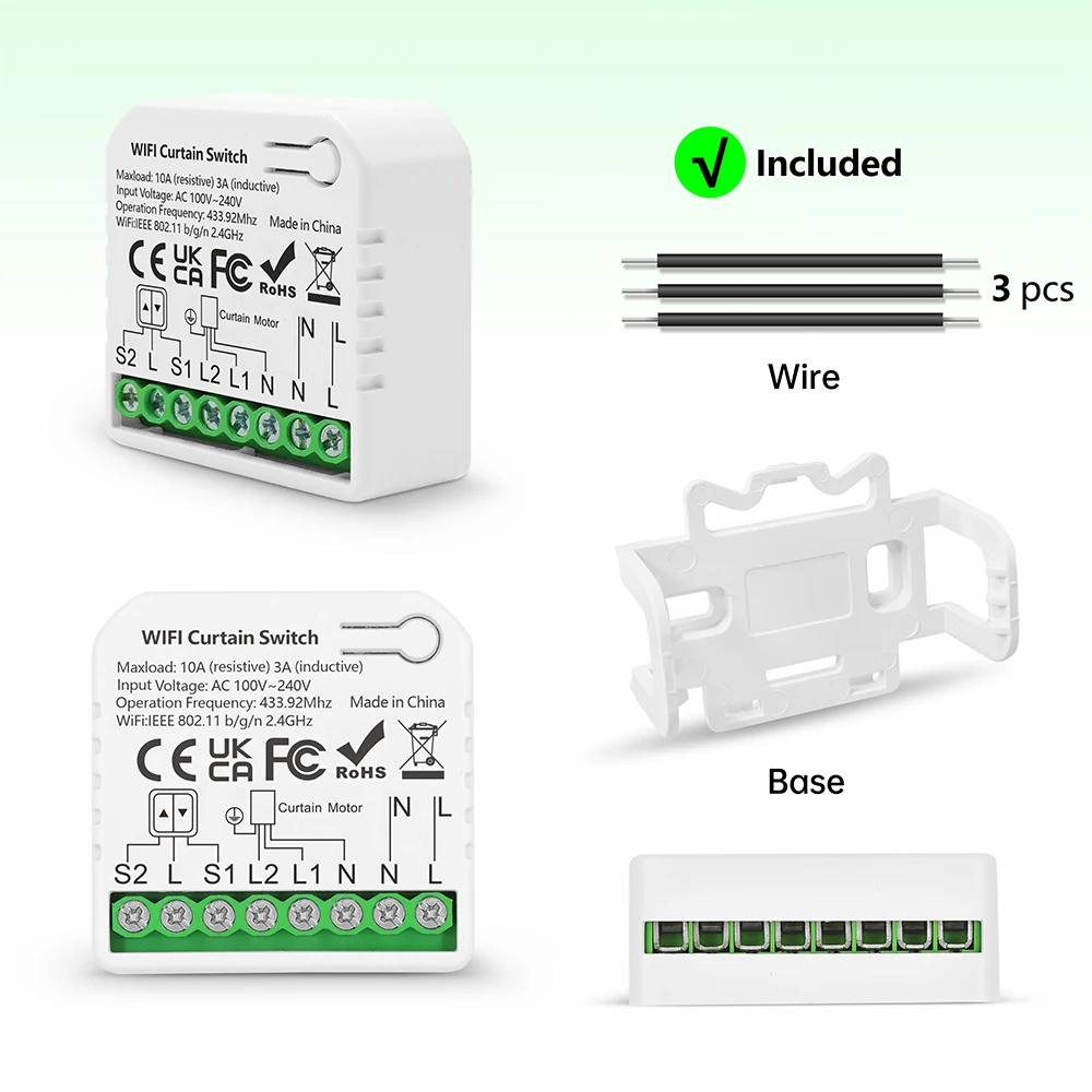 Los puertos de cableado rediseñados hacen que el cableado sea extremadamente simple y tiene 3 áreas de cableado separadas.Los 3 puertos a la izquierda son para un interruptor de pared con cable tradicional, los tres puertos en el medio son para motores de cortina/CA y los dos puertos a la derecha son para entradas L N.