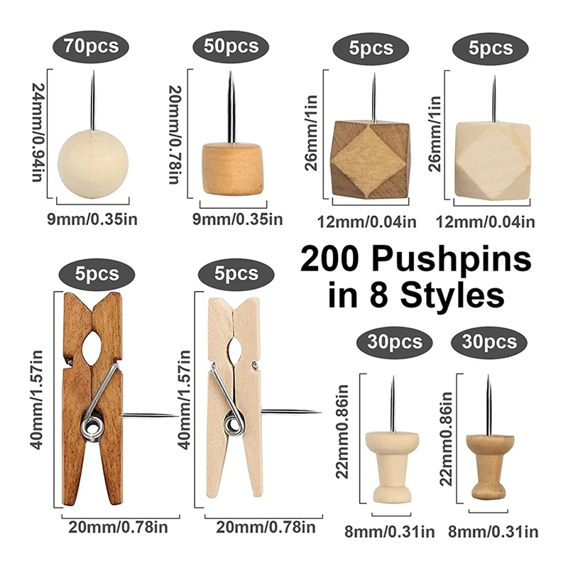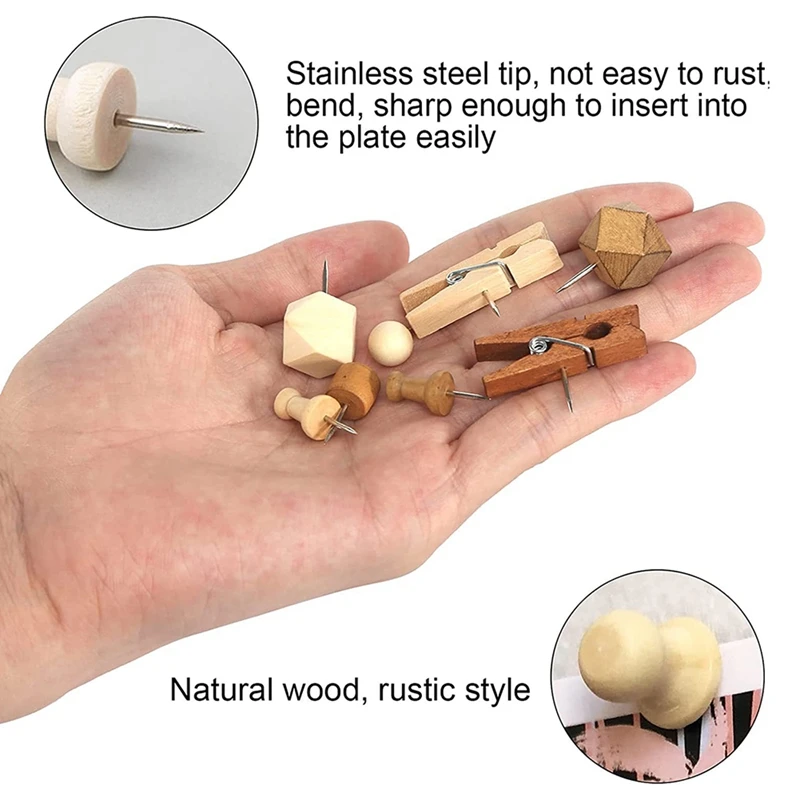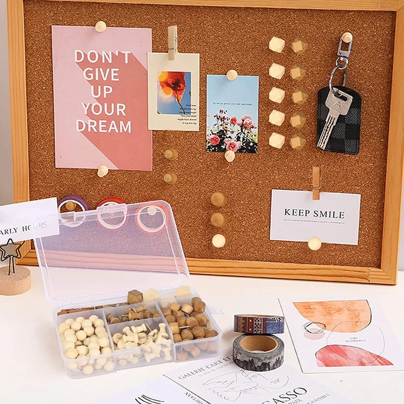 Comprar Alfileres de empuje de madera, tachuelas de madera, alfileres de tablero con caja de almacenamiento para tablero de corcho, fotos