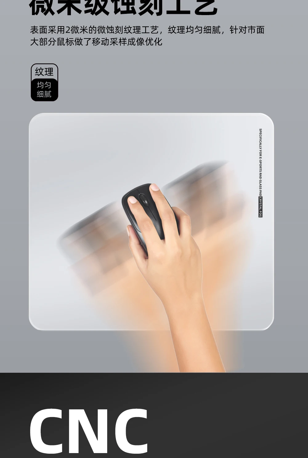 La superficie adopta un proceso de textura de micrograbado de 2 micras, con textura uniforme y delicada.Ha sido optimizado para muestreo de imágenes móviles para la mayoría de los ratones del mercado.