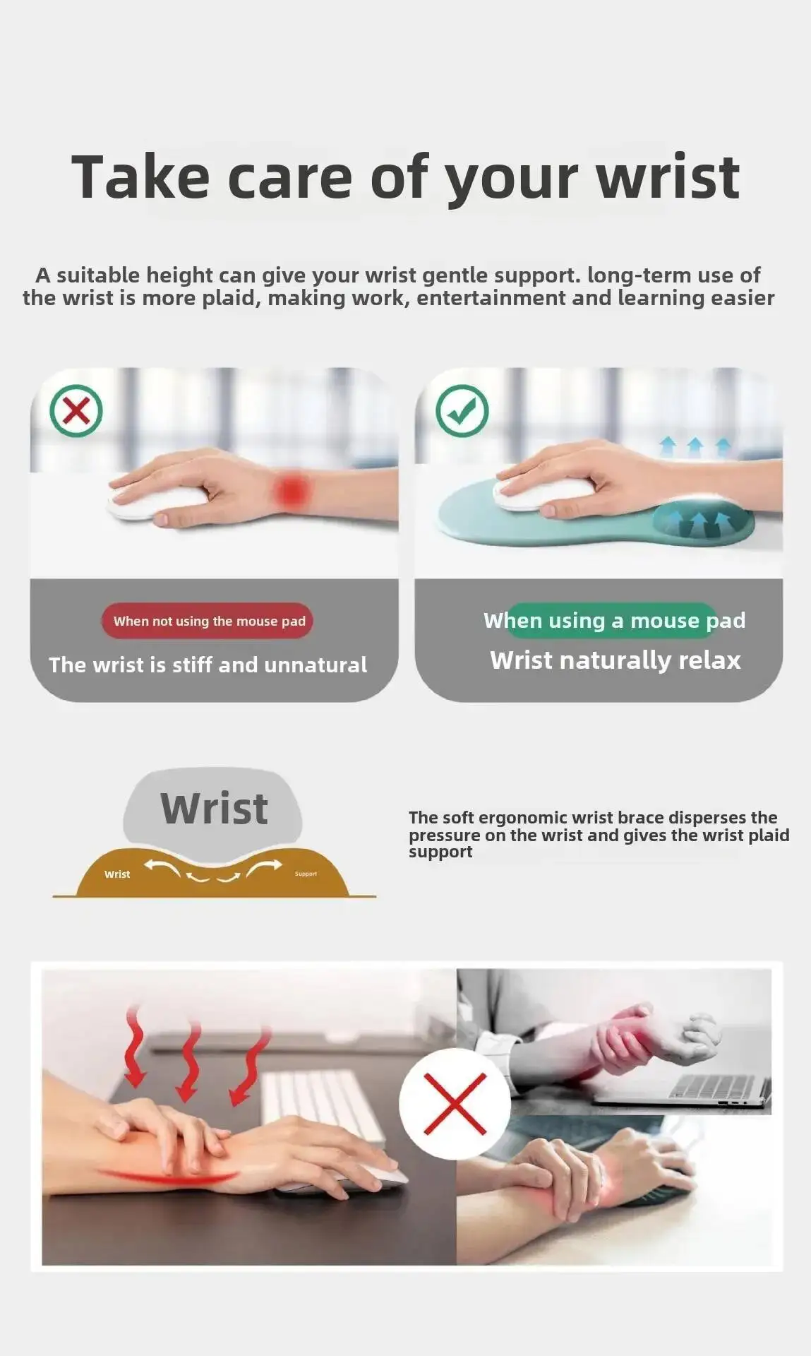 - La alfombrilla para mouse rellena de gel con una ranura especialmente diseñada proporciona un soporte óptimo para la muñeca, ofreciendo mayor comodidad y alivio ergonómico.El reposamuñecas de gel se adapta a su muñeca para un ajuste perfecto, lo que reduce la tensión durante largas horas de trabajo o juego.