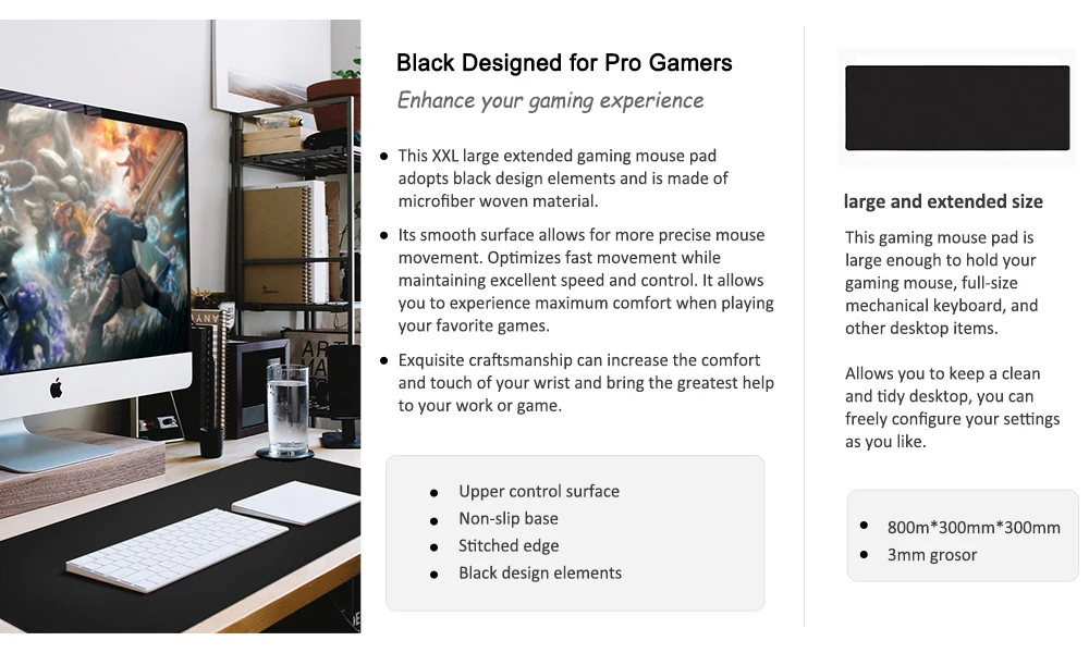 • Tamaño grande para un uso cómodo:Con un tamaño de 800x300x3mm, Esta alfombrilla de ratón proporciona un amplio espacio para un uso cómodo, reduciendo la tensión en la mano y la muñeca.