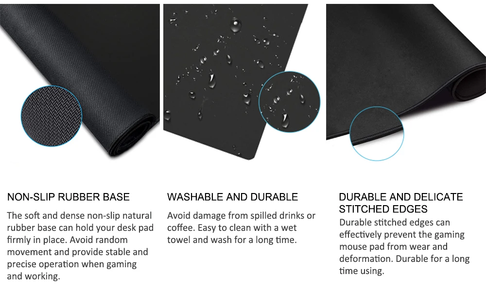Alfombrilla de ratón grande diseñada profesionalmente, que puede proporcionar suficiente espacio para acomodar el ratón y el teclado y otros suministros de oficina. Tendrá mucho espacio para juegos de estilo profesional o tareas de negocios mientras mantiene su escritorio protegido en todo momento.