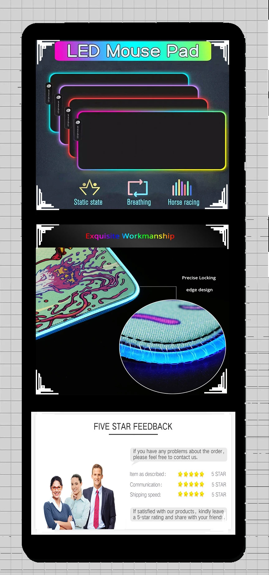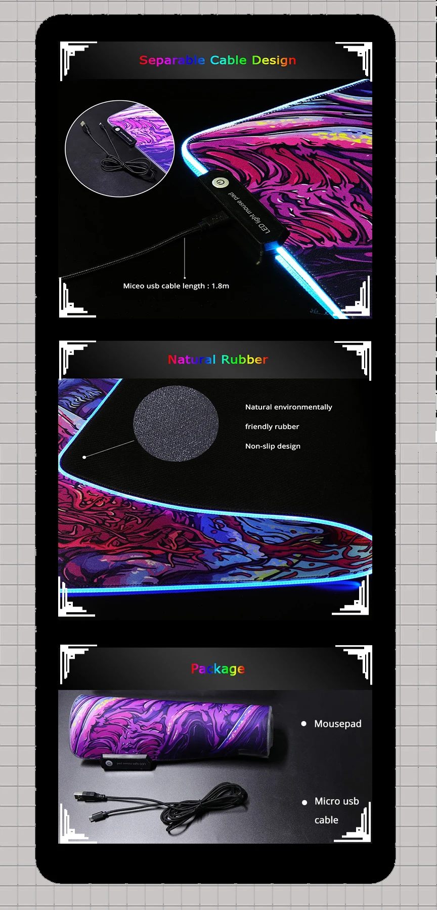 Bordes cosidos: nuestras alfombrillas para mouse utilizan bordes cosidos de colores para que no experimentes ningún desgaste molesto mientras juegas.El diseño de nuestra alfombrilla para mouse está impreso encima del borde cosido para que aparezca suavemente hasta el borde sin romperse ni cubrirse.(Si desea bordes cosidos de otro color, como el negro.Por favor informe al servicio de atención al cliente)