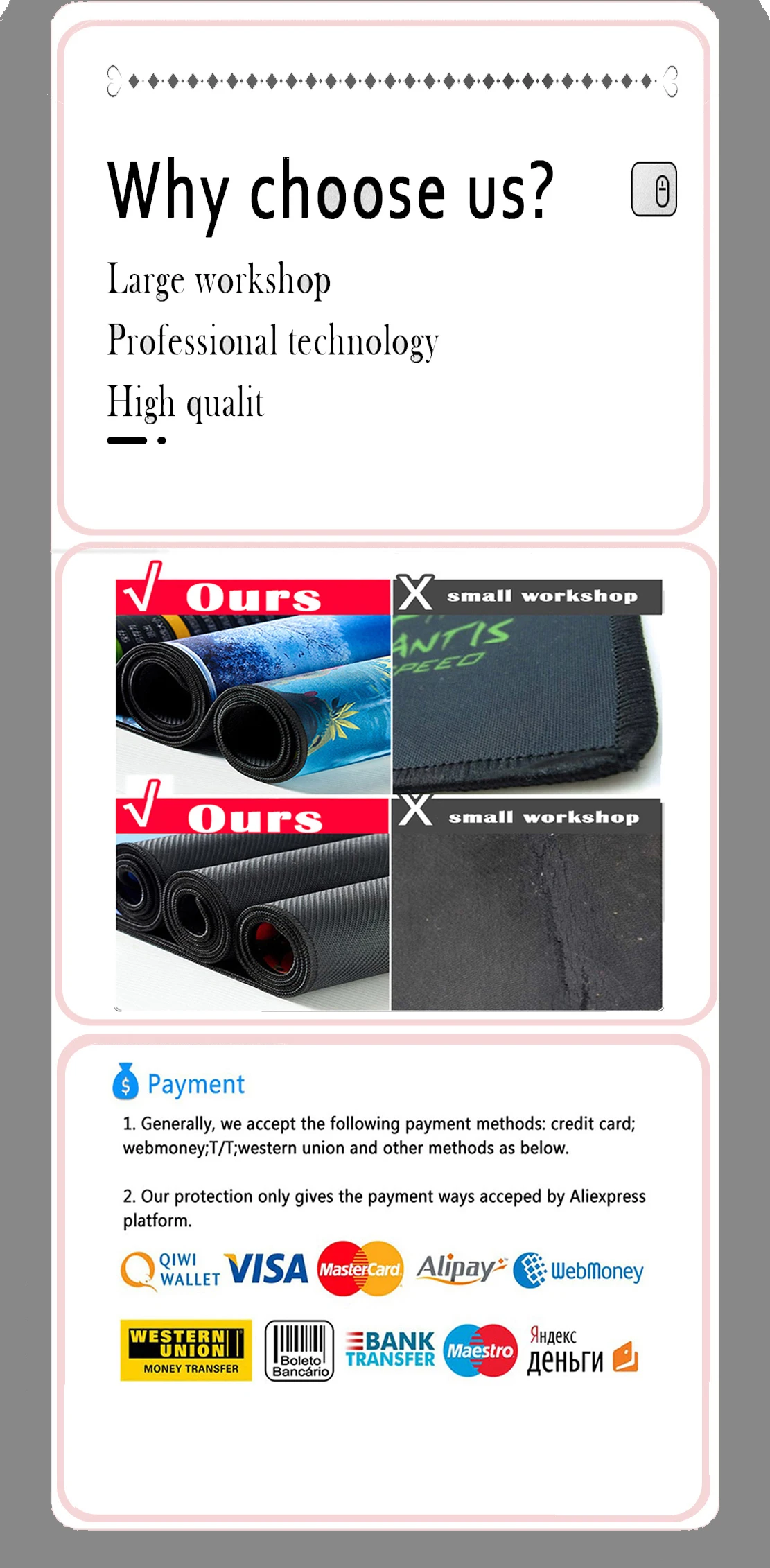 Dimensiones de la alfombrilla del ratón: la parte inferior de la alfombrilla del ratón está hecha de goma, que se expande y contrae cuando la máquina la calienta durante el proceso de fabricación.Normalmente utilizamos envoltorio en rollo.Después del transporte de larga distancia, la desviación de tamaño es de 0,5 a 3 cm, lo cual es un fenómeno normal.