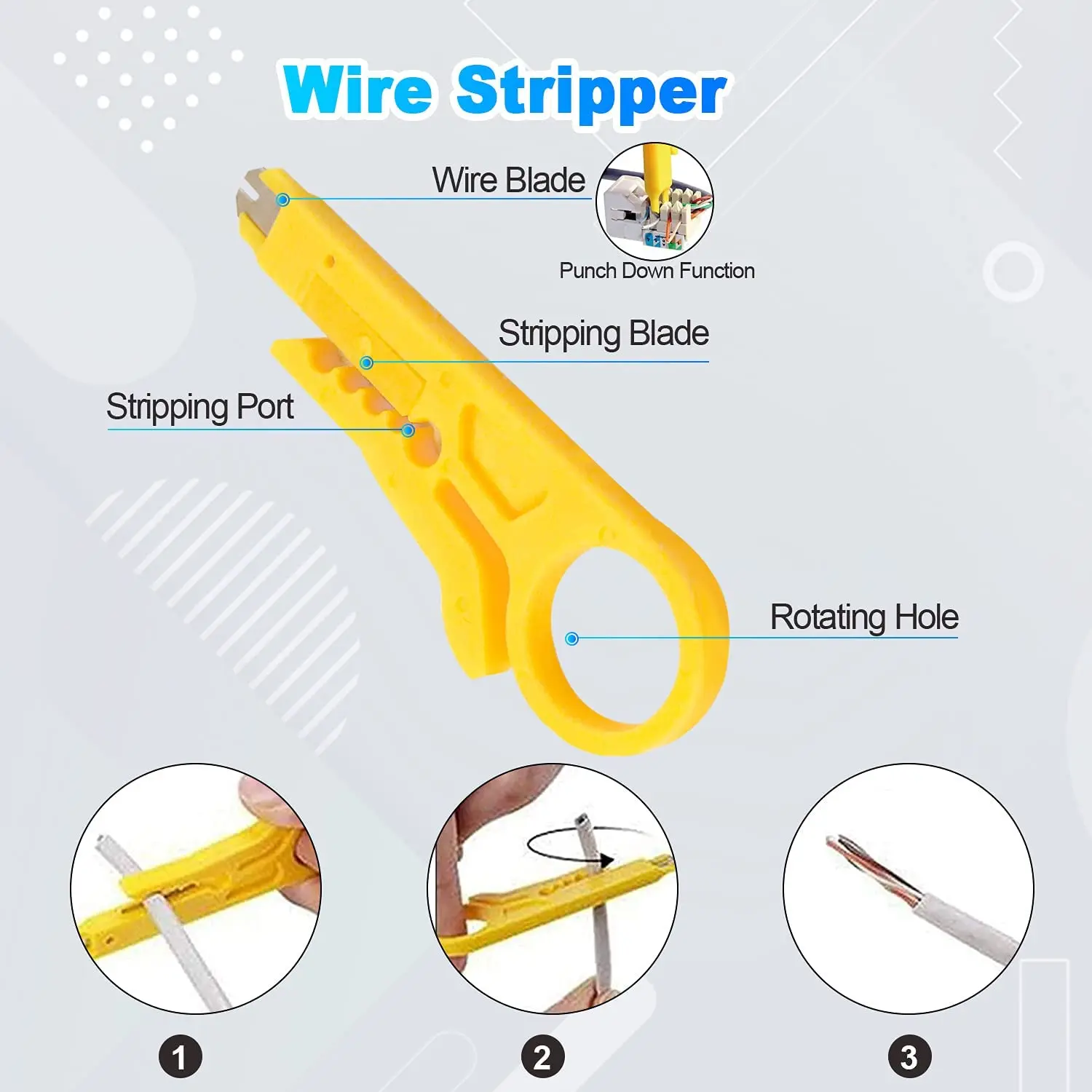 El kit de herramientas 11 en 1 incluye: alicates para engarzar, probadores de cables de red, cuchillos para pelar cables, destornilladores planos/cruzados, cuchillos para pelar, herramientas perforadoras y conectores RJ45.