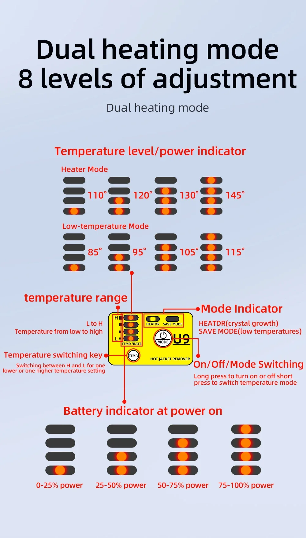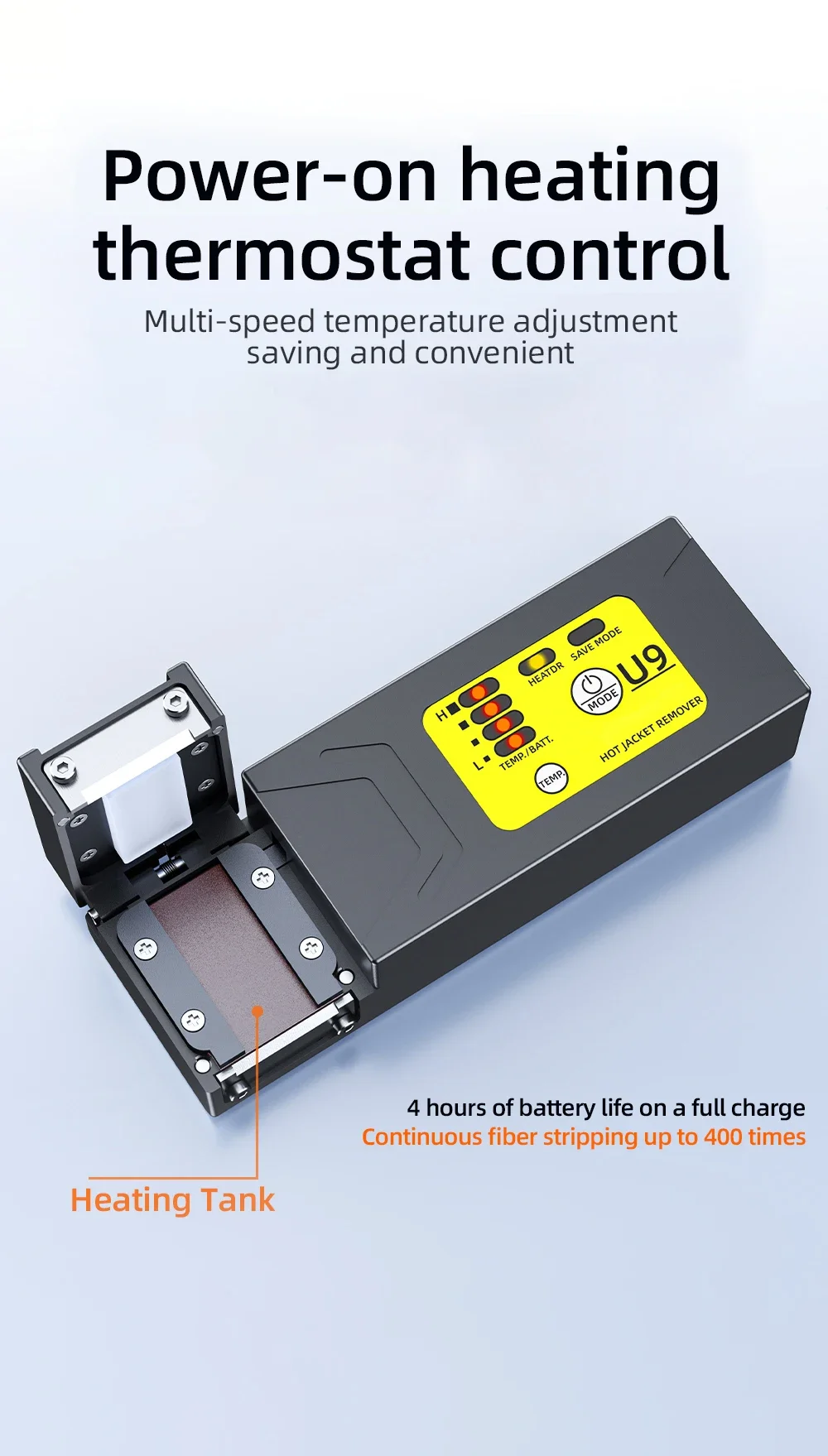 The pliers provide 8 temperature settings across dual heating modes, allowing customization for different fiber types and stripping needs.