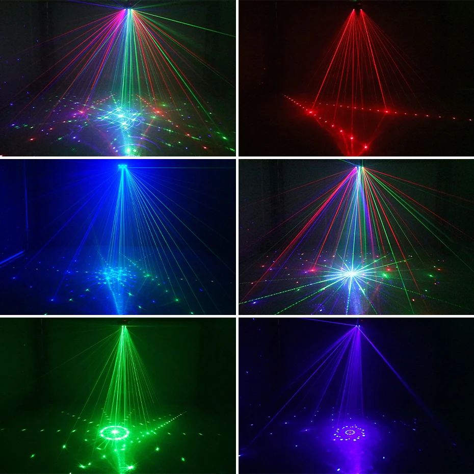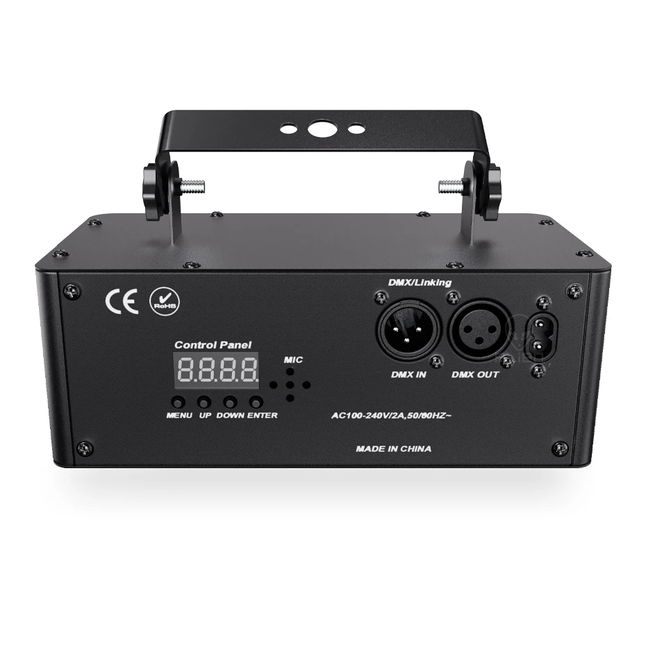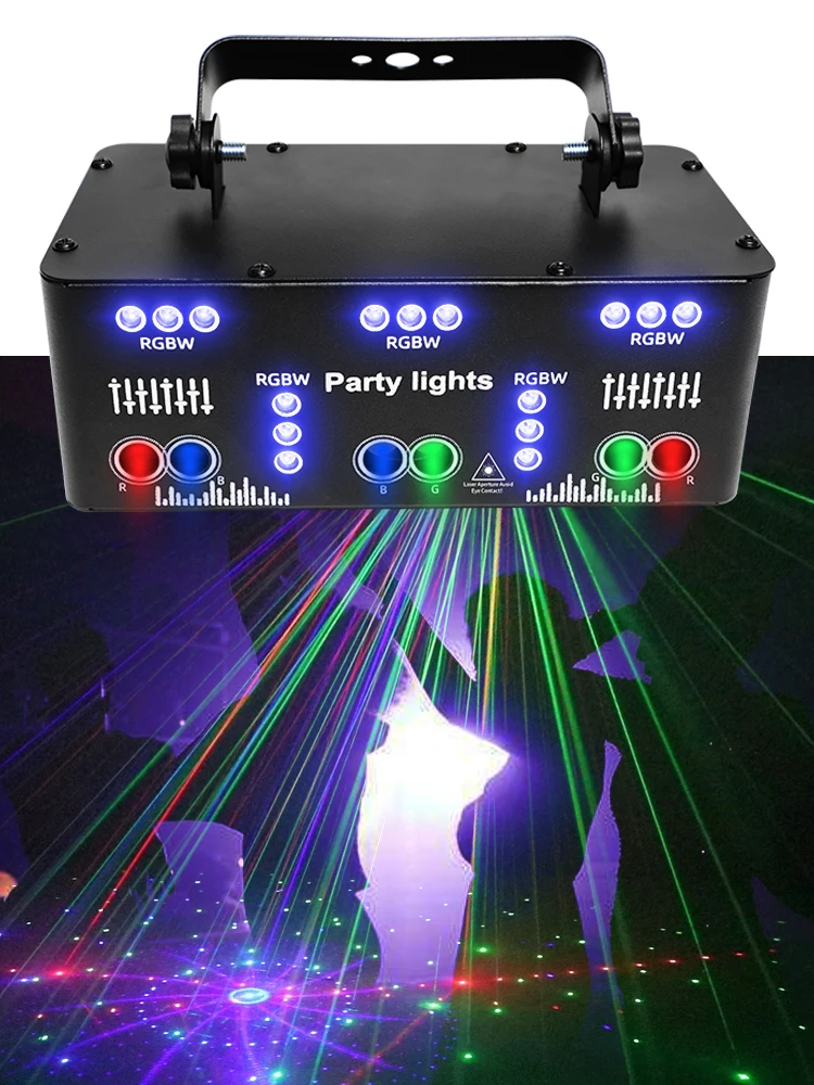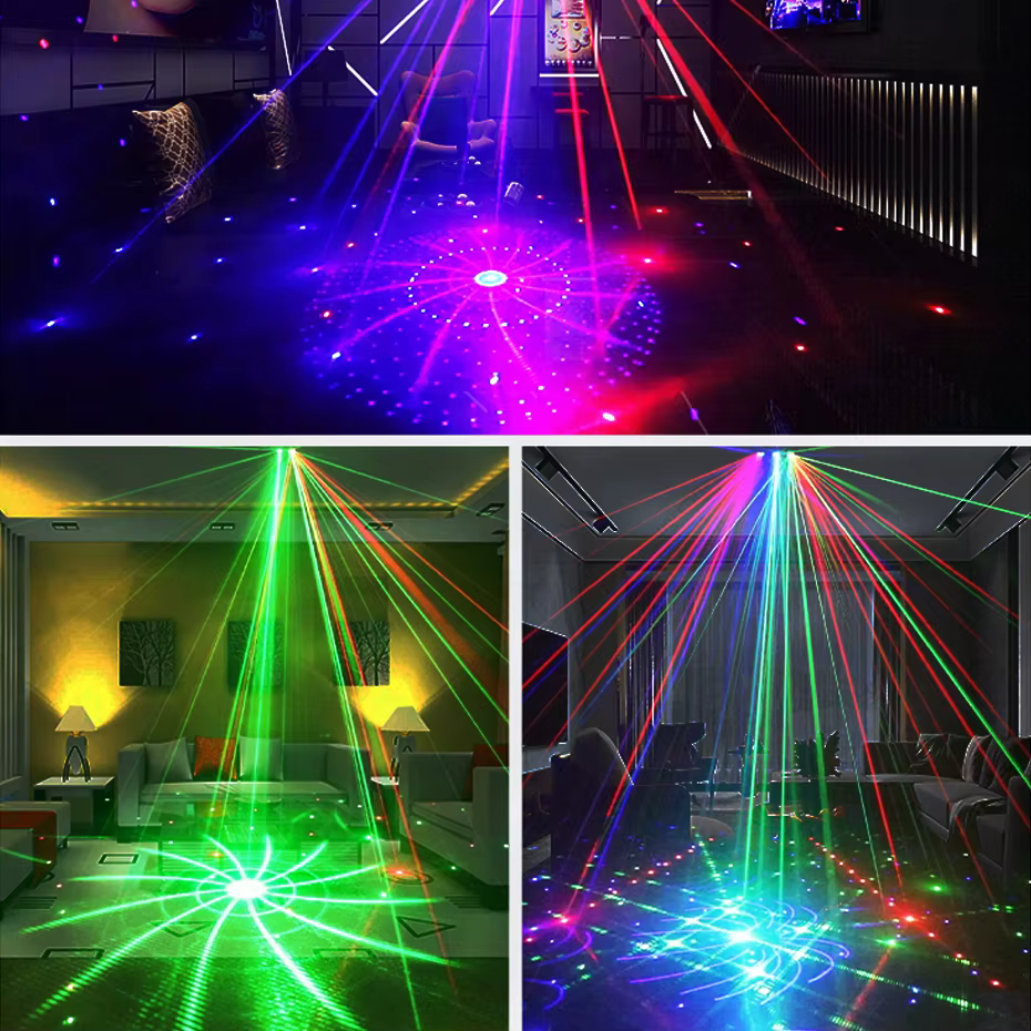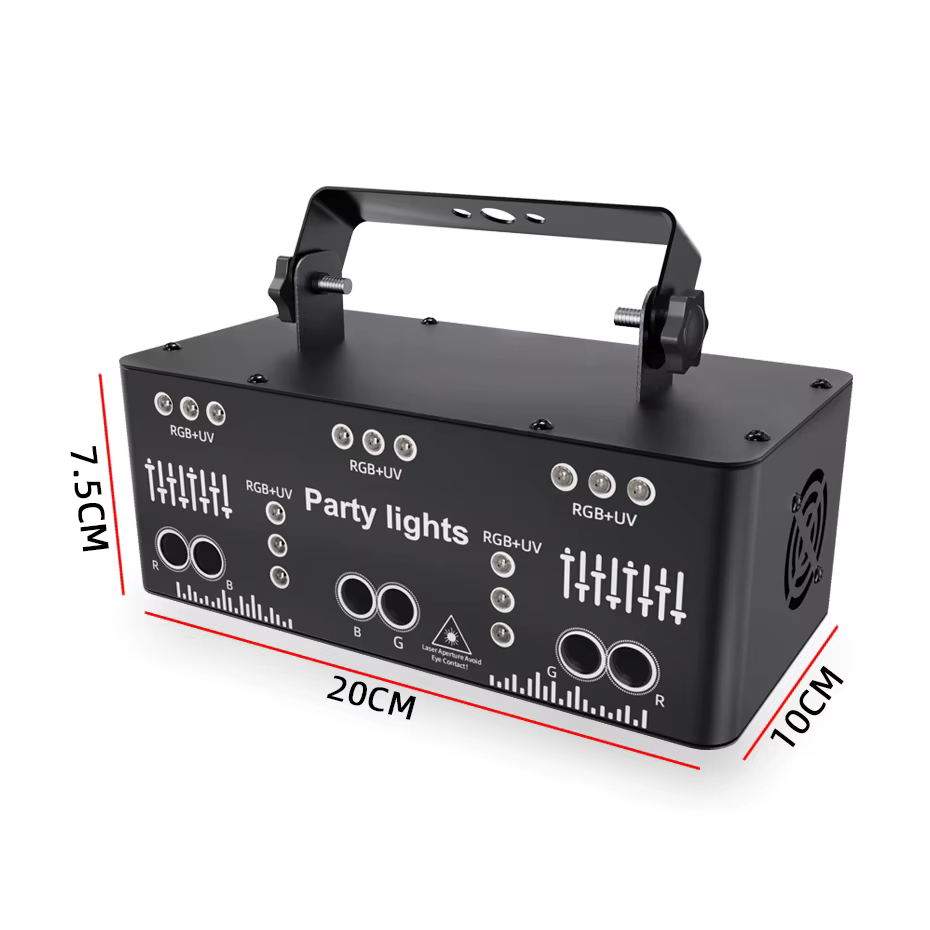 El láser es un láser rojo, verde, azul y efecto de luz de mezcla LED RGBWUV. Las fuentes láser garantizan colores brillantes y patrones de láser duales rojo y verde. El láser RGB incluye un control remoto IR para control inalámbrico y para cambiar entre programas activados por sonido o automáticos. En el modo Dmx, también tiene control total de todos los patrones. Es ideal para aplicaciones semiprofesionales y es perfectamente adecuado para bares, clubes medianos y discotecas. Así como para DJs móviles, uso privado y en cualquier otro lugar de fiesta.